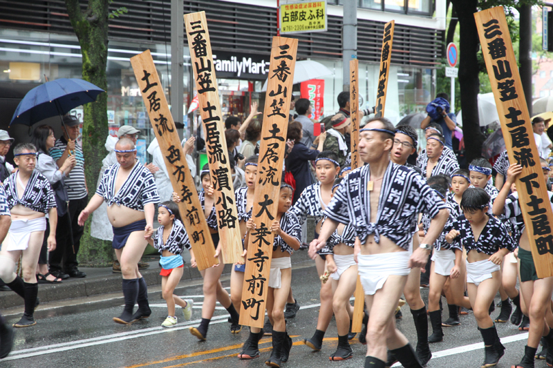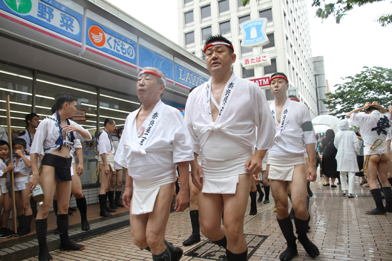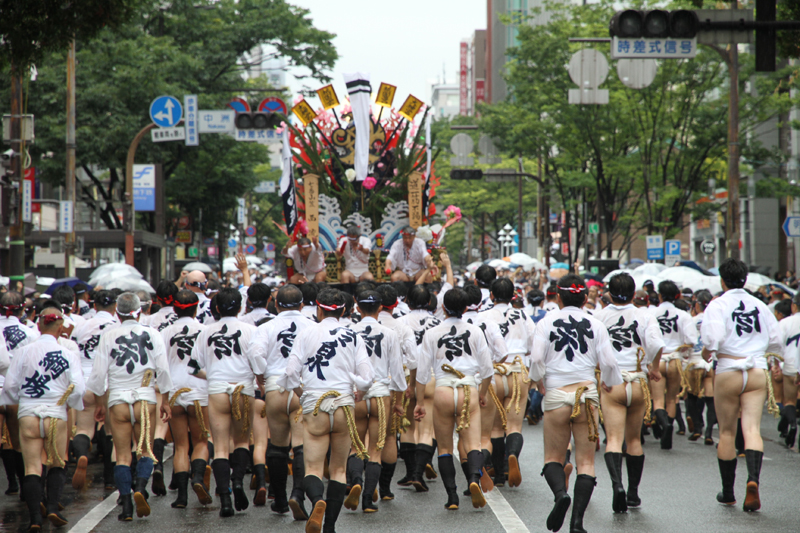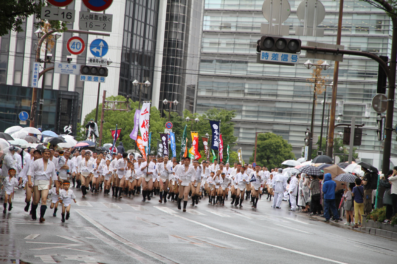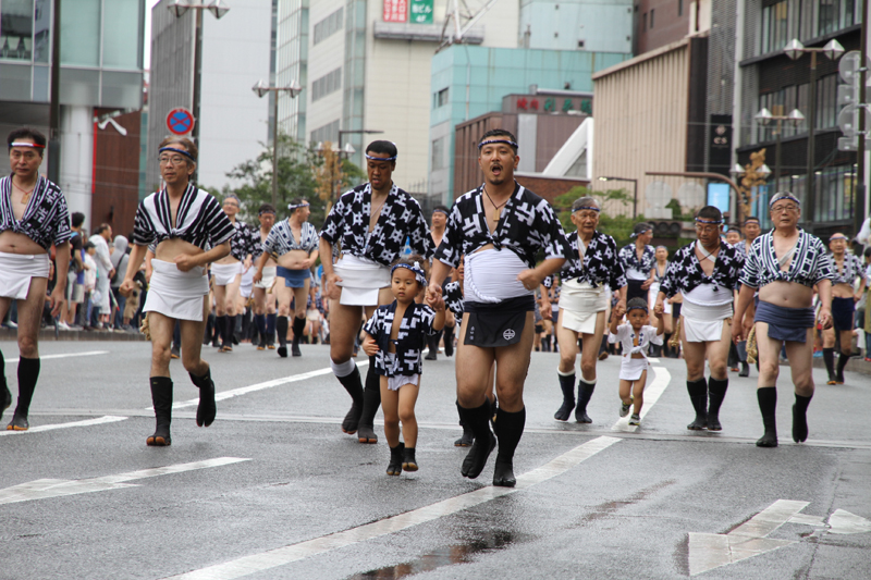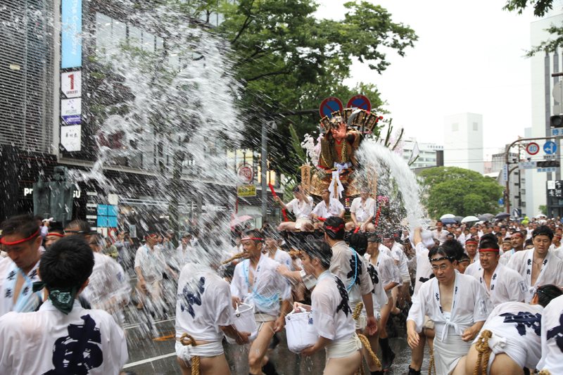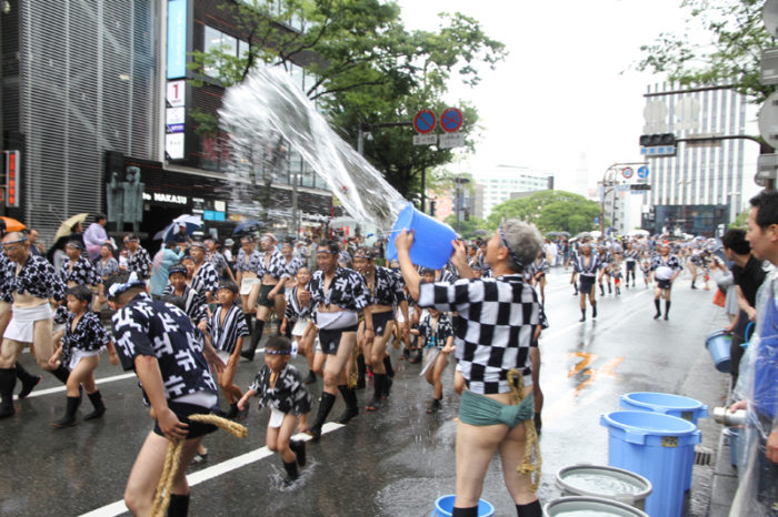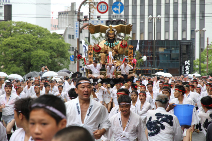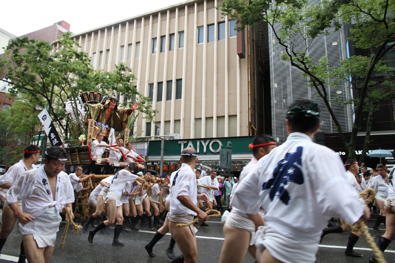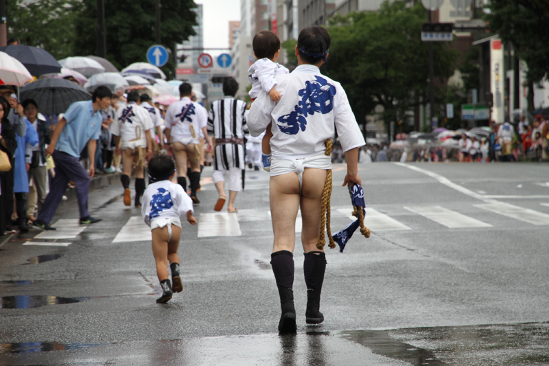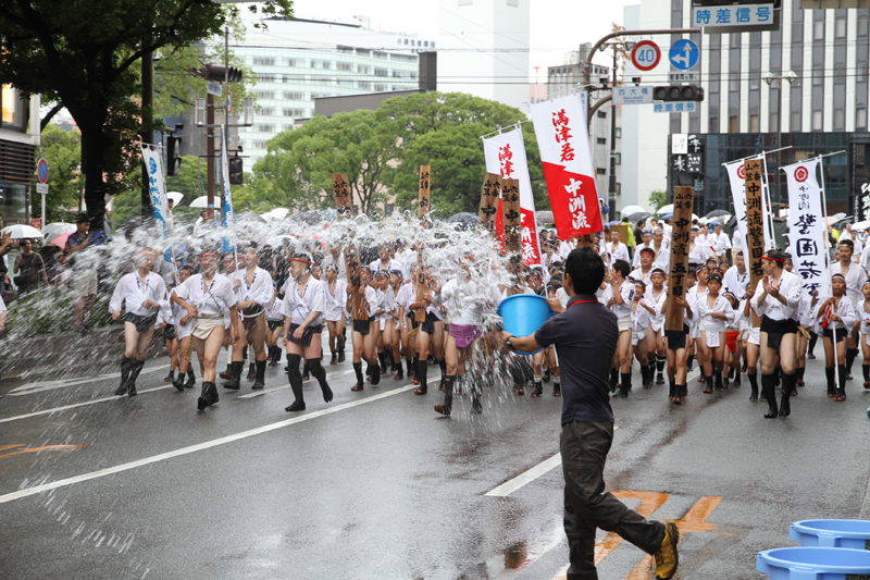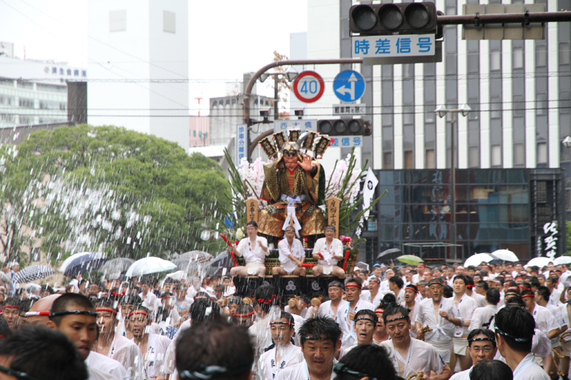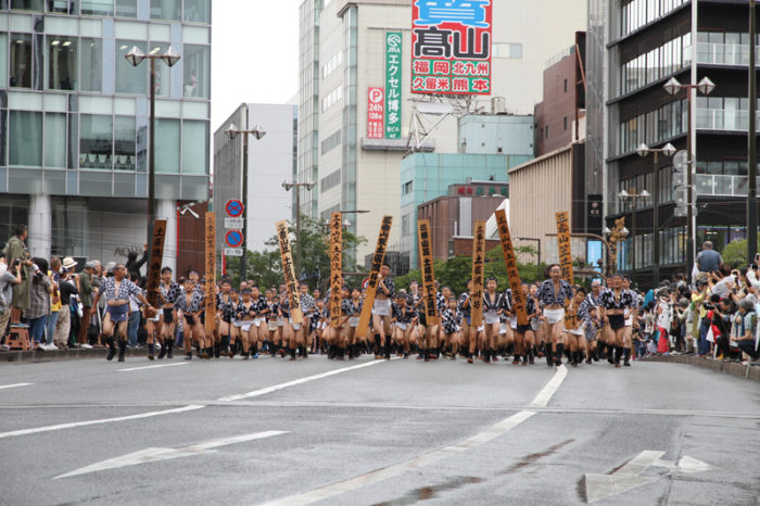 昨日の晴れた天気と打って変わって、雨の一日となった本日7月13日(土)。博多祇園山笠は山笠行事で唯一博多部(博多)から福岡部(天神)に舁き入れる人気の行事「集団山見せ」が行われ、天候が悪い中、たくさんの山笠ファンが沿道に詰めかけ福岡部への山笠舁き入れを楽しみました。