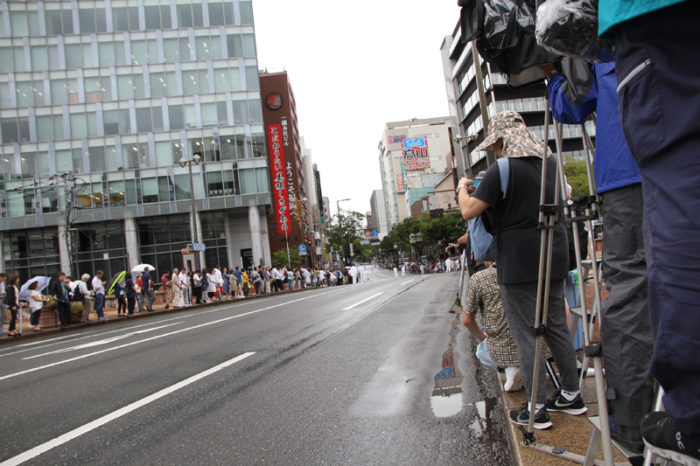 午後3時半前になると、あれだけ強く降っていた雨が次第に弱まってポツポツ状態に。沢山の見物客が沿道を埋め、今か今かと待っています。