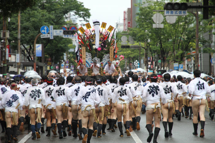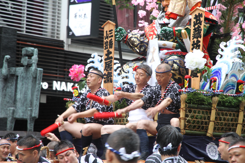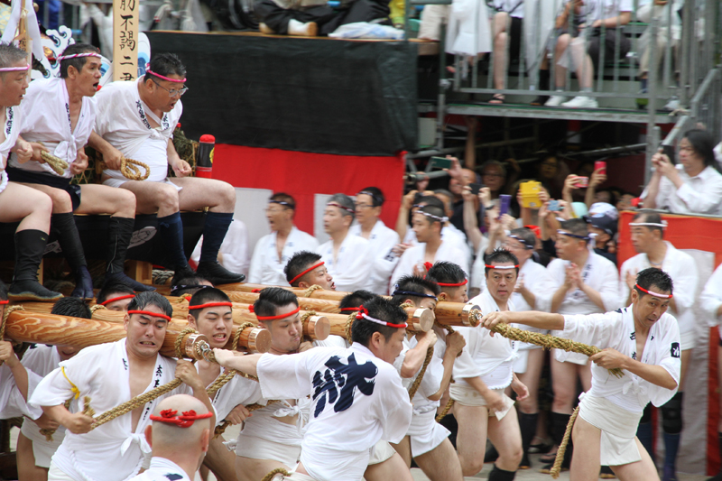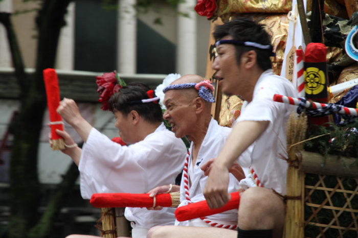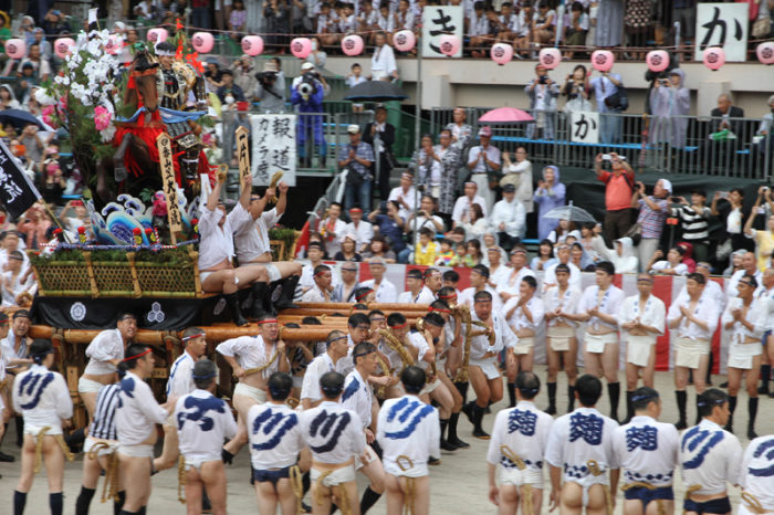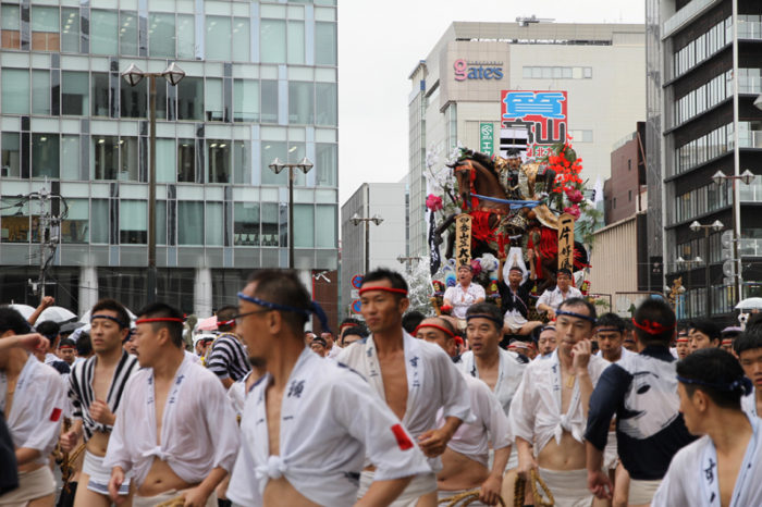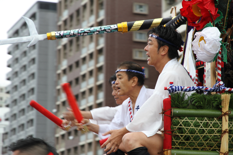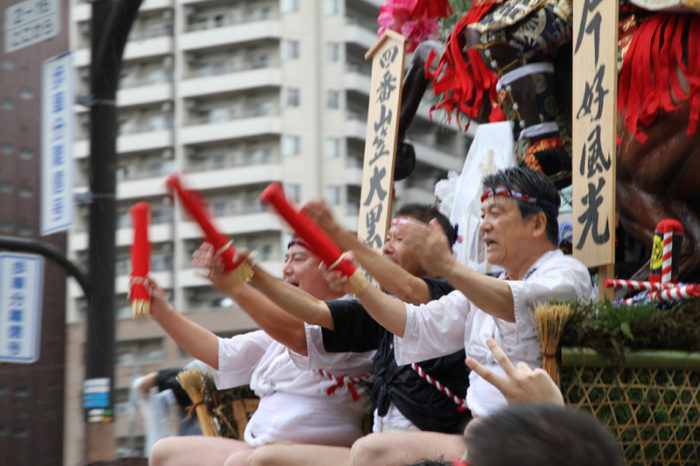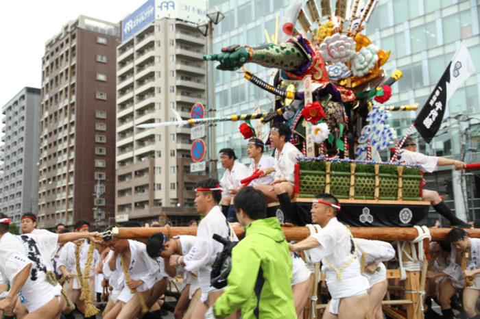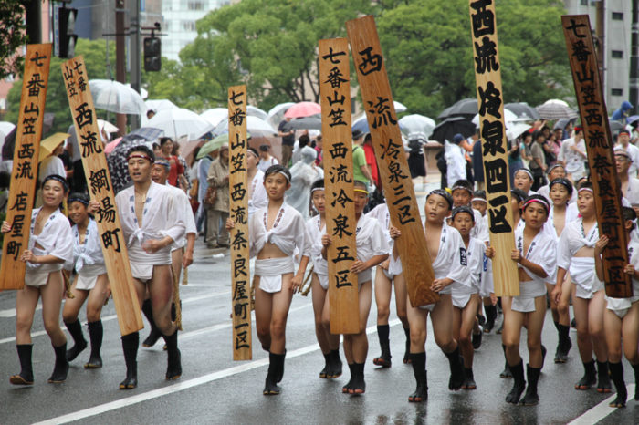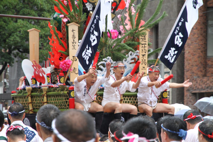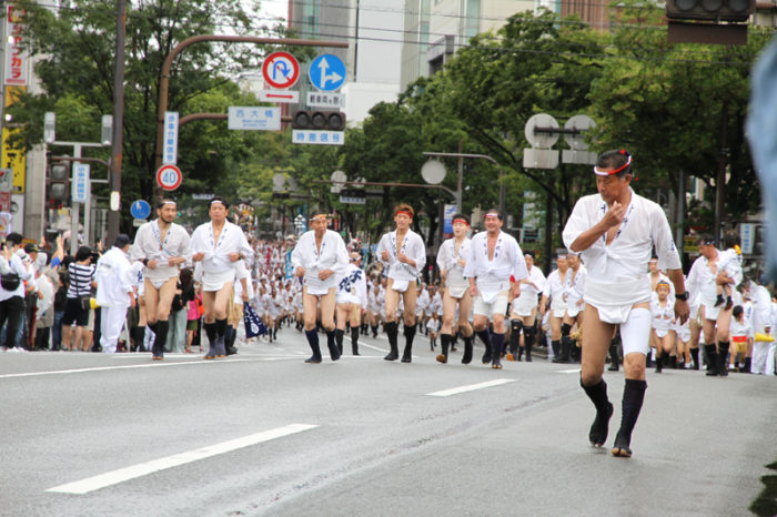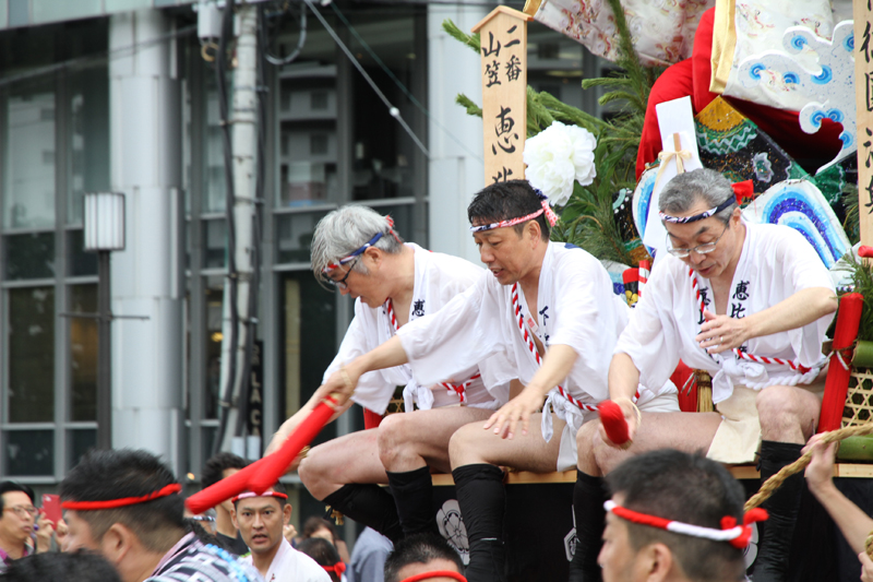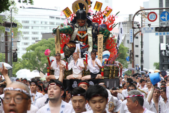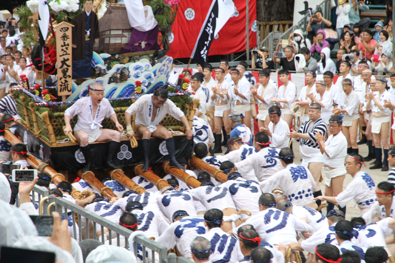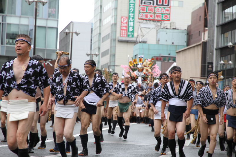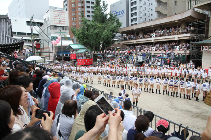 しかし、この集団山見せの日のもう一つの目玉はここから。千代流・恵比須流・土居流・大黒流・西流の五流は、山小屋に戻る前に櫛田入りを行ってから戻っていくのです。これは予定された行事ではなく、また特別発表されているわけでもないイベントのですが、5つの流が櫛田入りを行ったうえ桟敷席は無料開放されているという事で人気となっていき、桟敷席は今日は追い山か追い山ならしか?!と思うぐらい満員状態。一昔前までは隠れた見どころだったのですが、今ではまったく隠れてない大人気イベントとなりました。