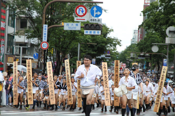 5分おきに各流がスタートしていき、西大橋を渡って福岡市役所前を目指します。