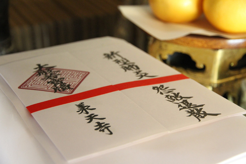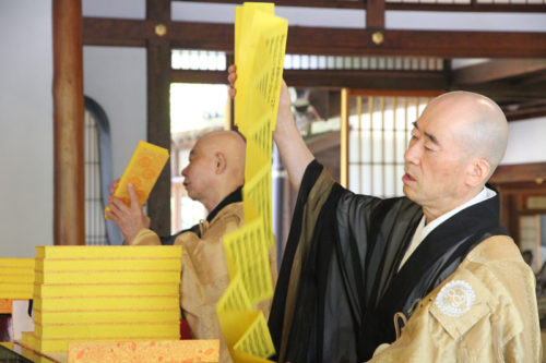 祭壇には承天寺の祈願の札が置かれており法要で祈願が掛けられます。今年のお札の裏には「新型肺炎怨敵退散」と筆で書かれており、この状況下の早期終息を祈願する特別な御札となっています。