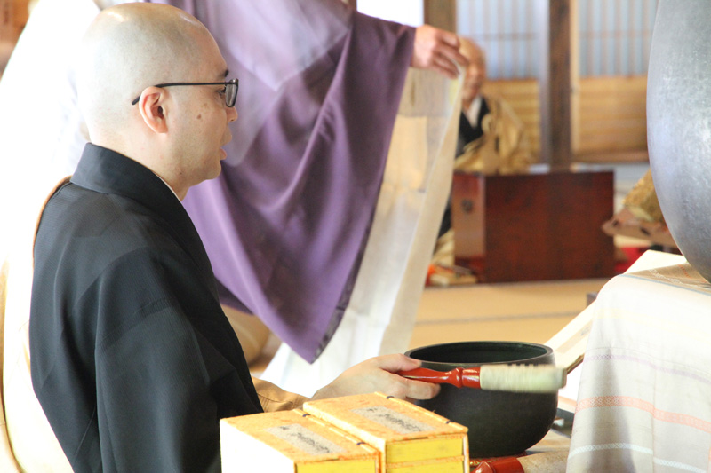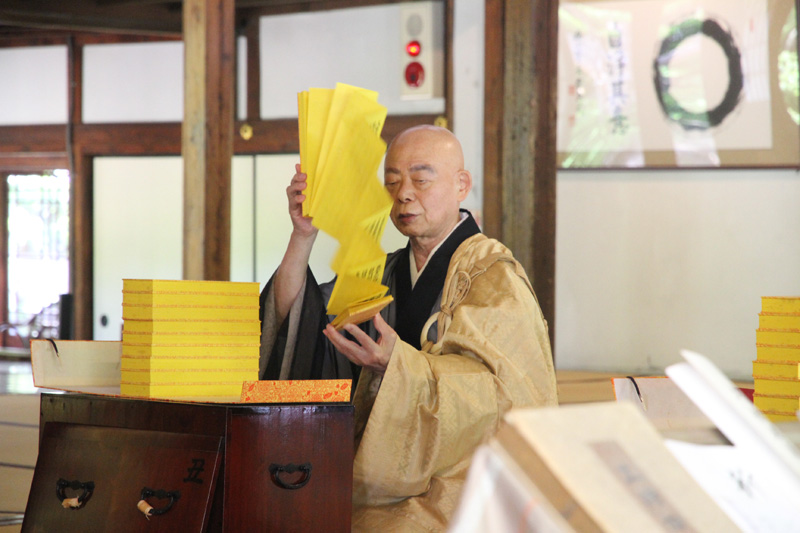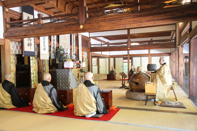 午前8時半、夏祈祷の始まりを告げる鐘が叩かれ、方丈に住職らが入場し、大般若経の教典が収められた櫃の前に着座すると、2020年度の夏祈祷の法要が始まりました。