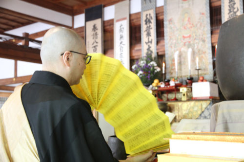 読経の中、カーンカーンカーンと高い鐘の音が連続して叩かれると、住職らが目の前にある櫃を開け、全部で16部600巻に及ぶ『大般若波羅蜜多経』を取り出します。いよいよ『転読(てんどく)』が始まります。