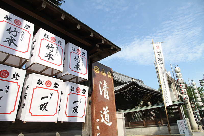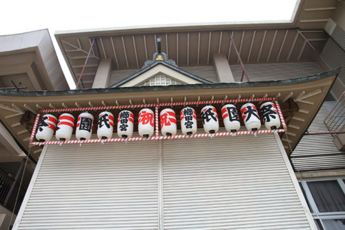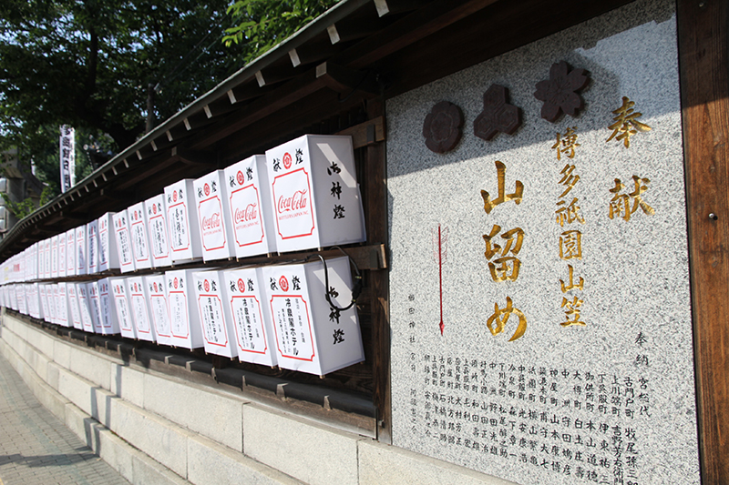 7月1日まであと5日。櫛田神社の外壁に献灯雪洞と、能舞台に提灯が掛けれられました。