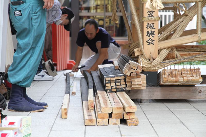 午前8時過ぎに山大工が次々と櫛田神社に到着。早速山小屋に入り、飾り付けの準備が始まります。