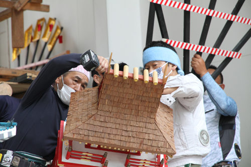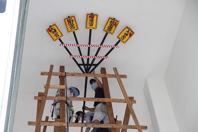 「真ん中には赭熊(しゃぐま:白い毛の飾り)が付きますよ」という山大工からのアドバイスを受け、実際に赭熊を立ててみて位置の調整を行いました。