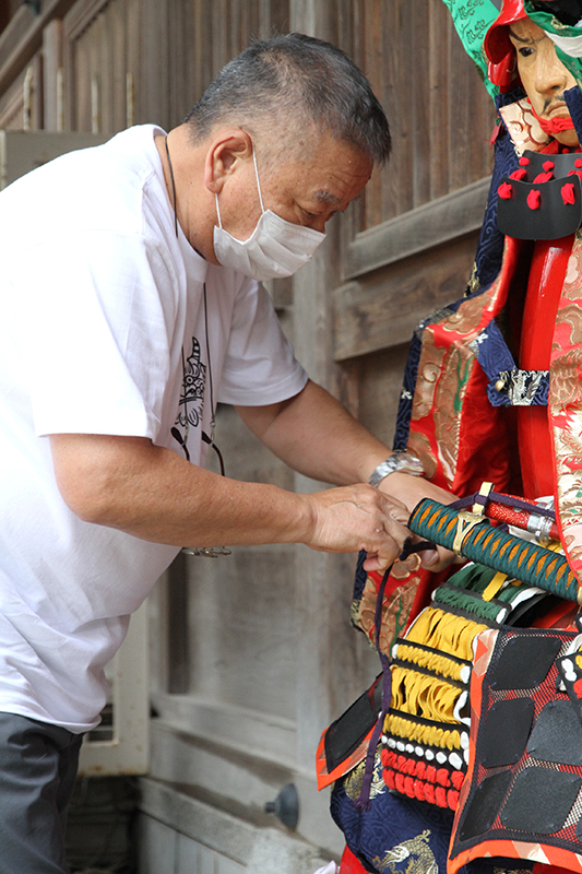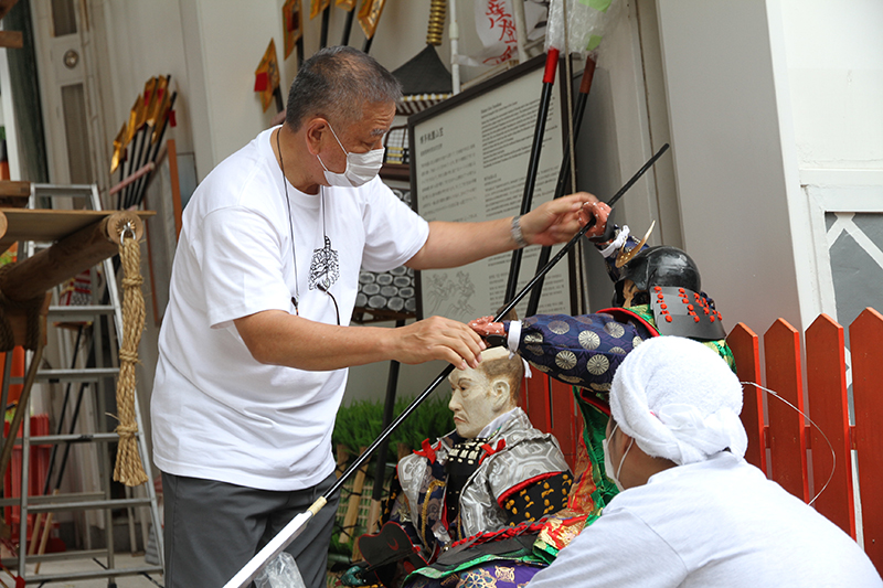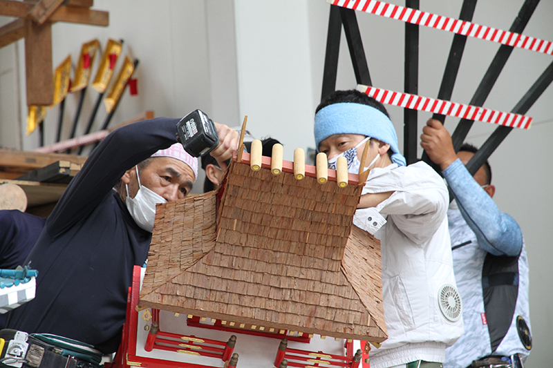 人形師や山大工は、人形の手に刀や槍を持たせたり、館を組み立てたり、飾り山に取りけるための針金を取り付けたりするなど、運び出した人形や飾りに飾り付けのための準備を施していきます。