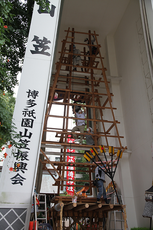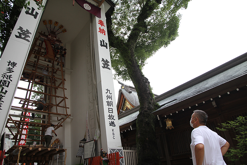 午後になると曇ってた午前とは一転して日差しが照り付ける快晴に。櫛田神社に参拝に来た人も飾り付けの様子を見物していきます。