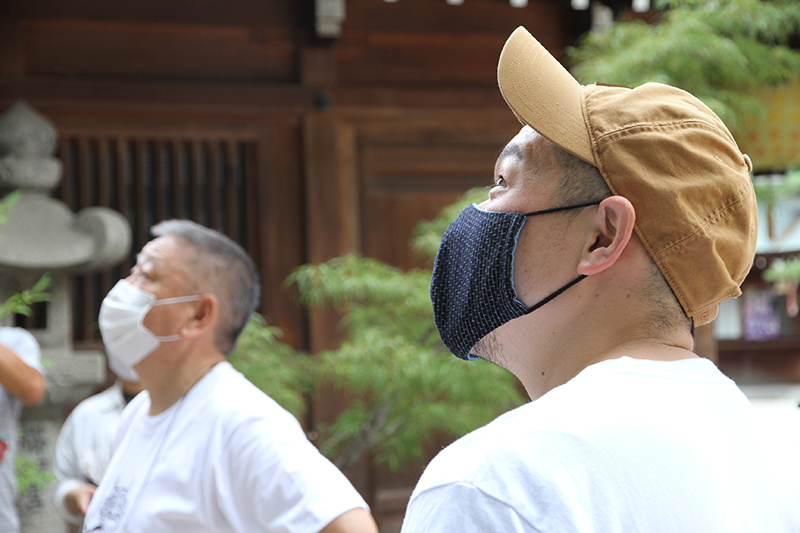 そして本年の櫛田神社の飾り山を手掛ける中村信喬人形師と中村弘峰人形師親子が到着。まずは櫛田神社にて拝礼を行いました。