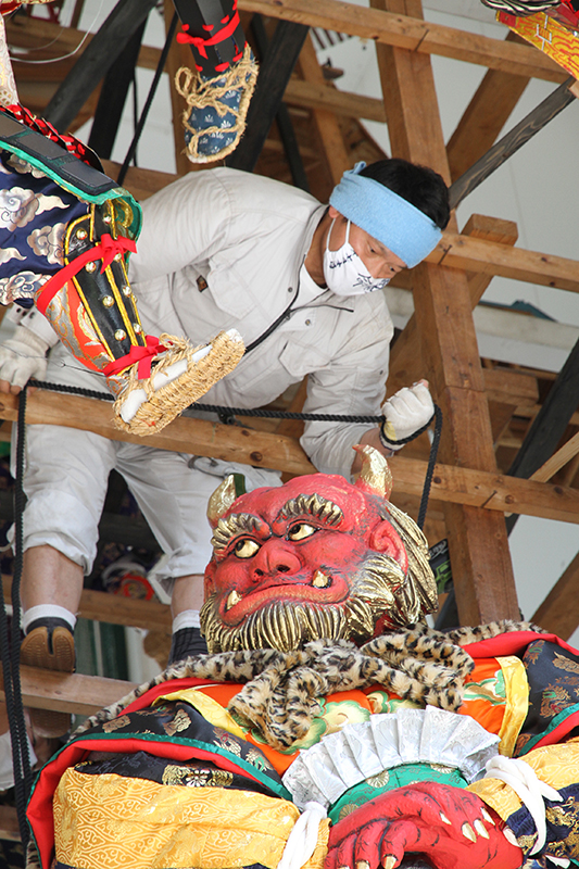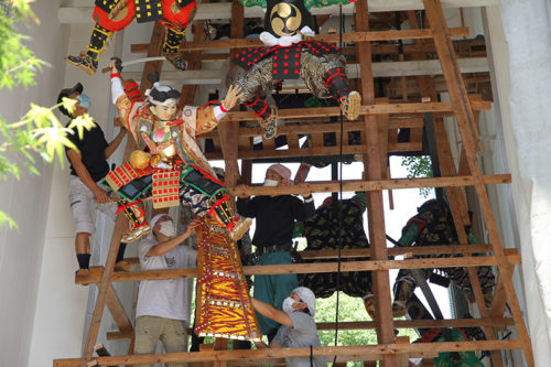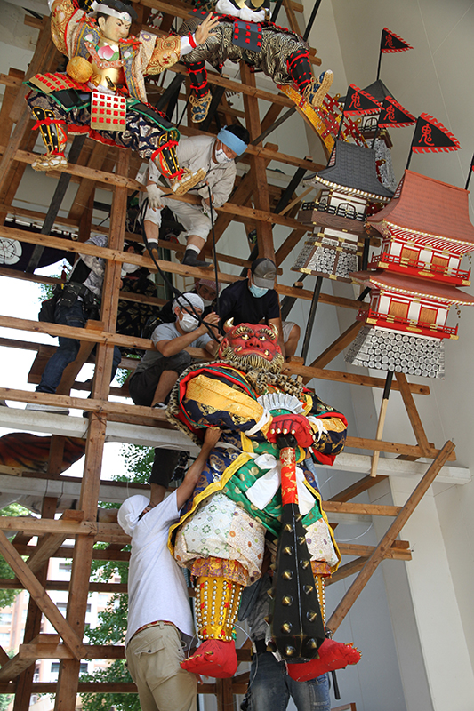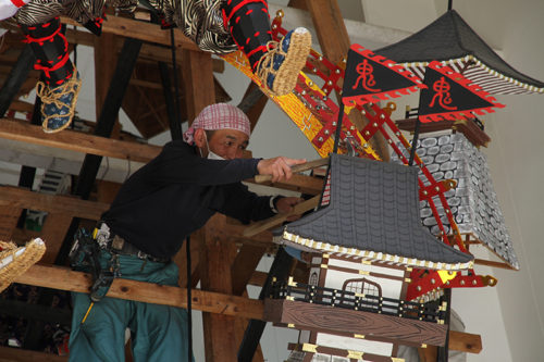 引き上げられた人形は、跳木と呼ばれる人形を固定するための木材に取り付けられ据えられます。飾り山の下から中村信喬人形師がイメージ通りの位置になるよう、細かい指示を出していきます。