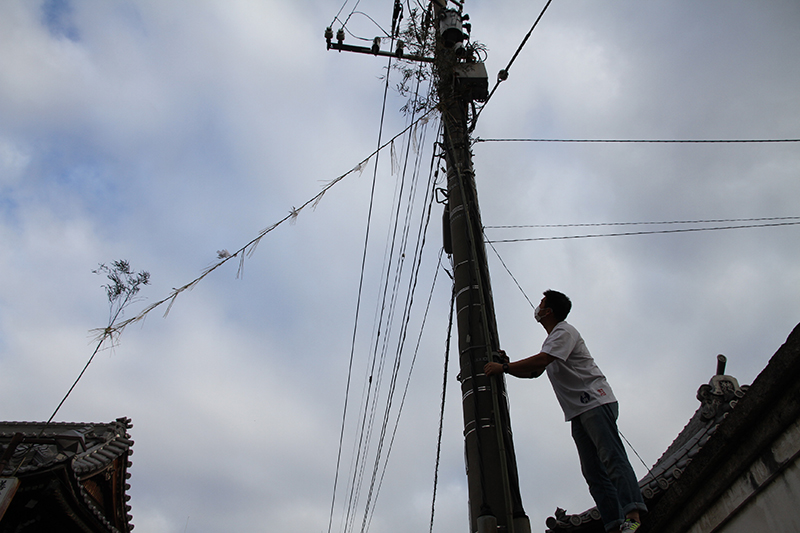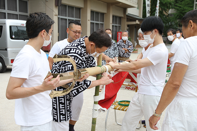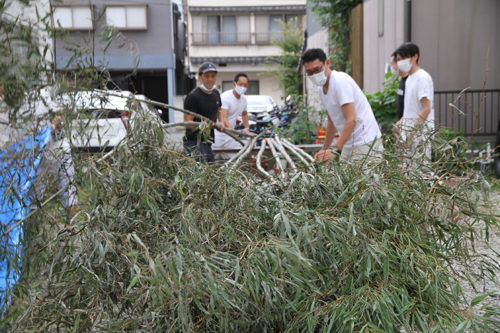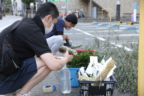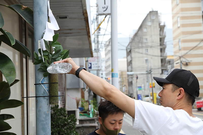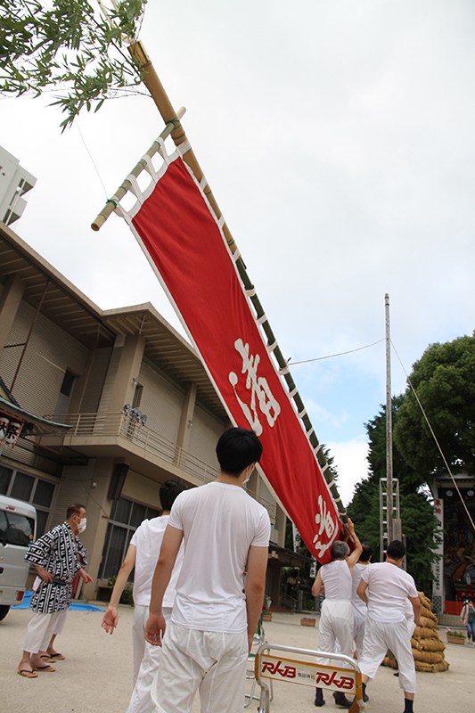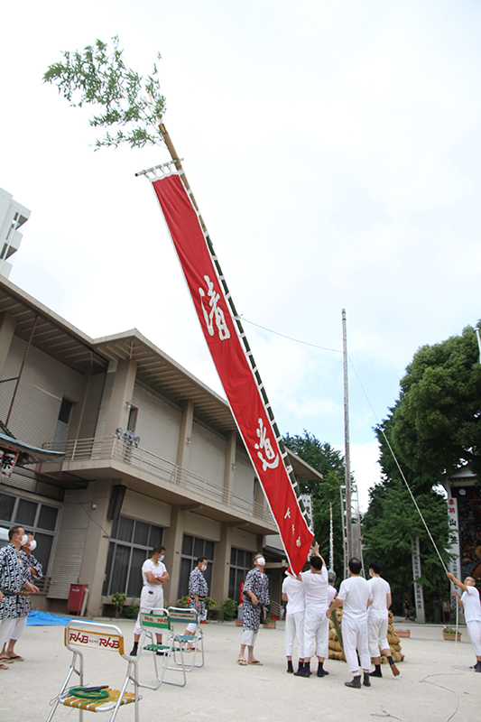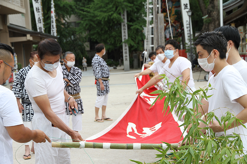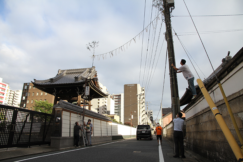 午前8時過ぎより、櫛田神社の清道では、東流の下東町が清道の旗を旗竿に掛ける作業を行いました。