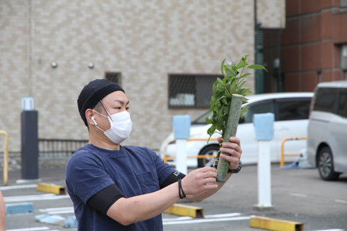 旗竿に飾りを竹を取り付けて、いよいよ掲揚へ。支点となる旗竿の端を玉垣に添え足で抑えこんで固定します。