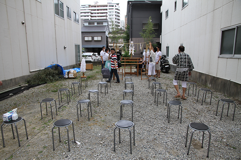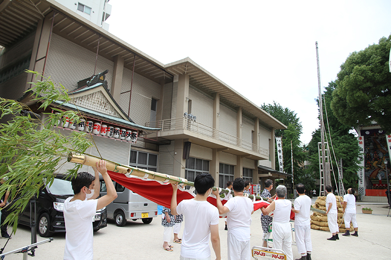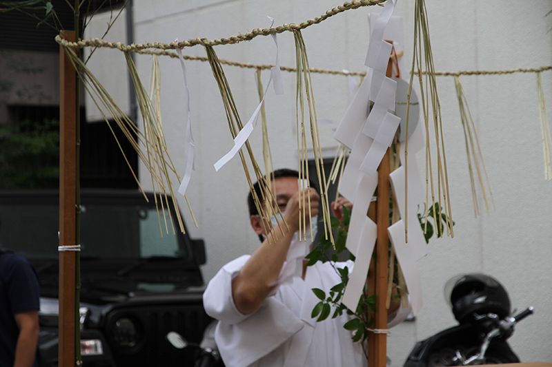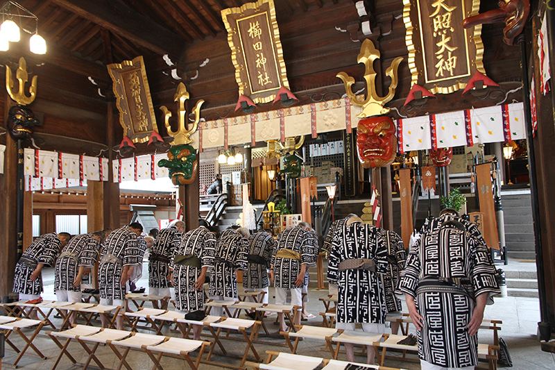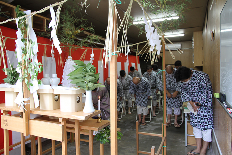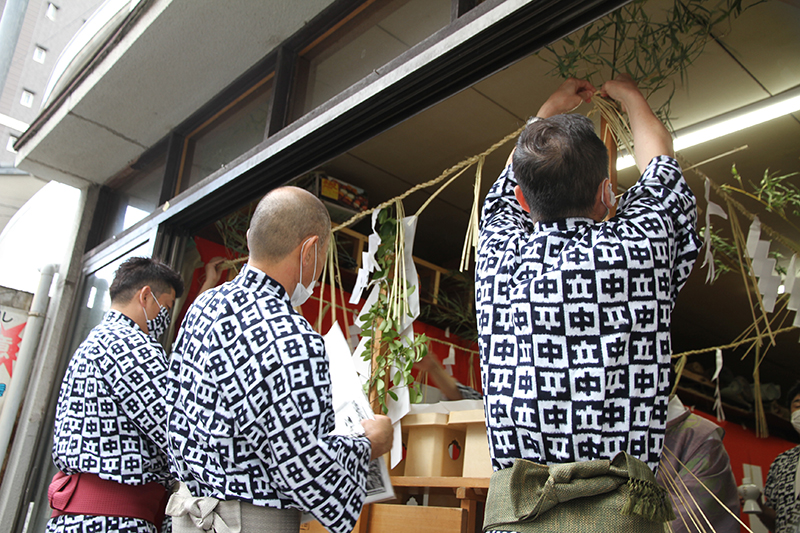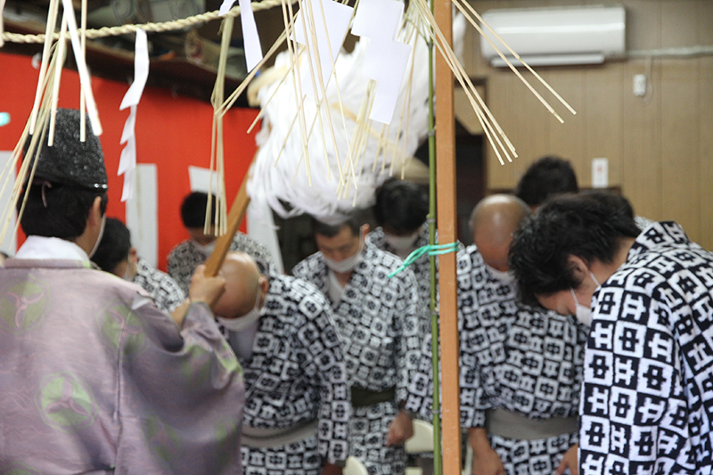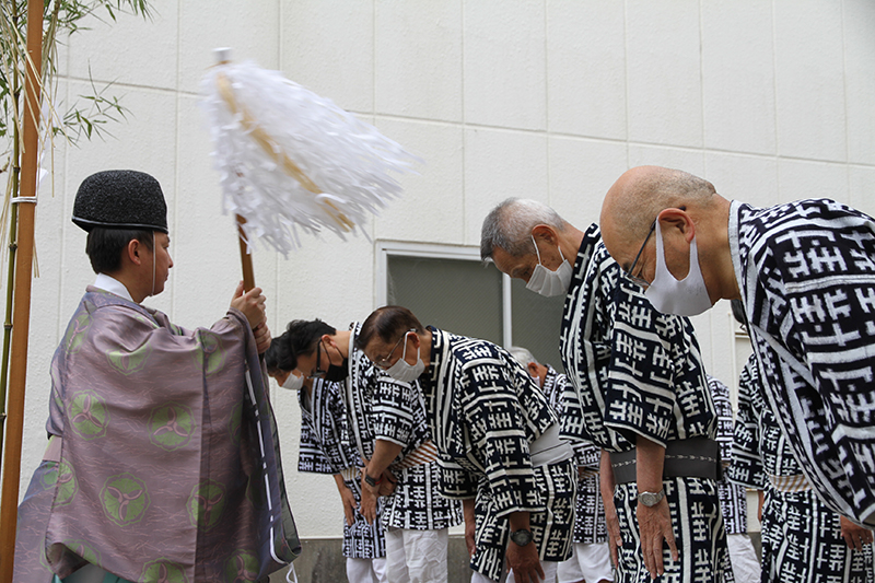 午前8時、祭壇と櫛田神社の方向に拝礼し、注連下ろしの神事が始まりました。