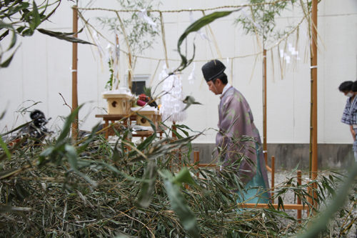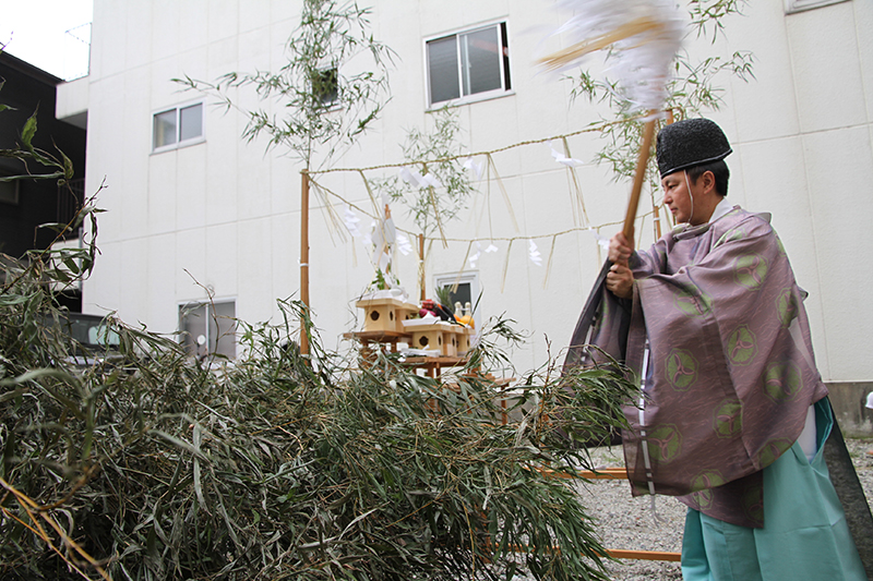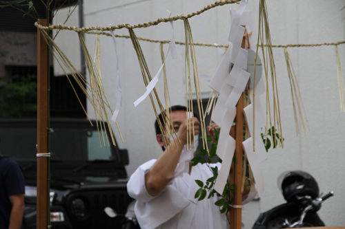 参加者と注連下ろしで掛けられる笹竹と注連縄が、櫛田神社の神職によって祓われました。