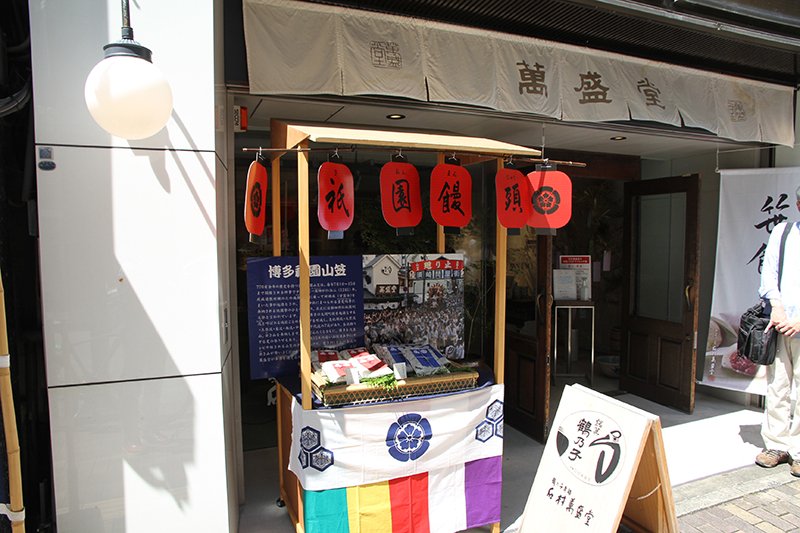山笠期間しか販売しない祇園饅頭の販売が本日より開始。現在土居通りの仮店舗で営業中の石村萬盛堂さんでは、店頭にて祇園饅頭の販売を行っていました。今年は櫛田神社の表と見送りの下絵を使った2種類の包み紙の2種類が販売されており、どちらを買おうか迷っている人の姿も見られました。