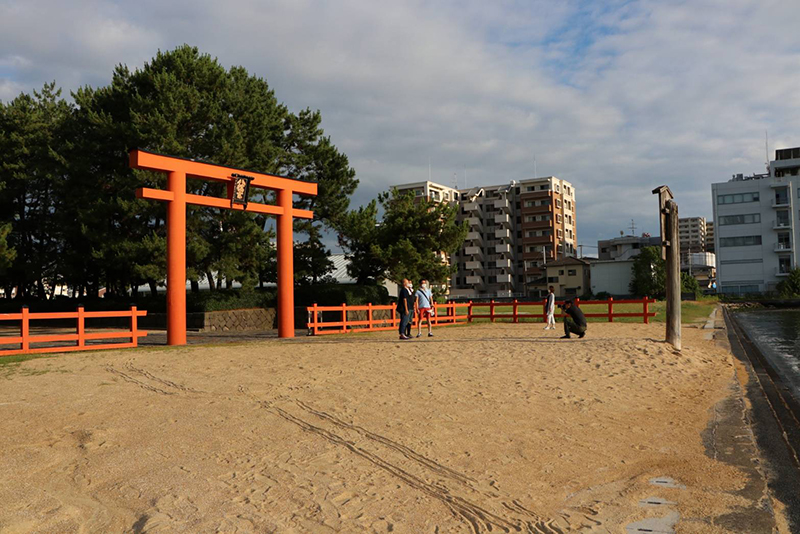 人気のないお汐井浜で夕日に向かって拝礼した後、お汐井を浜から集め持ち帰って行きました。