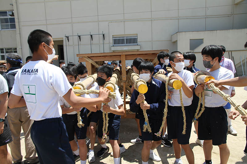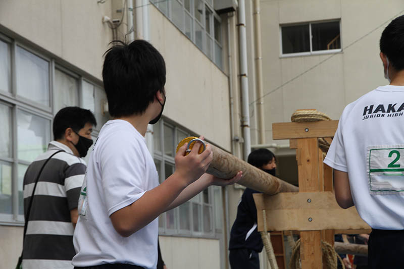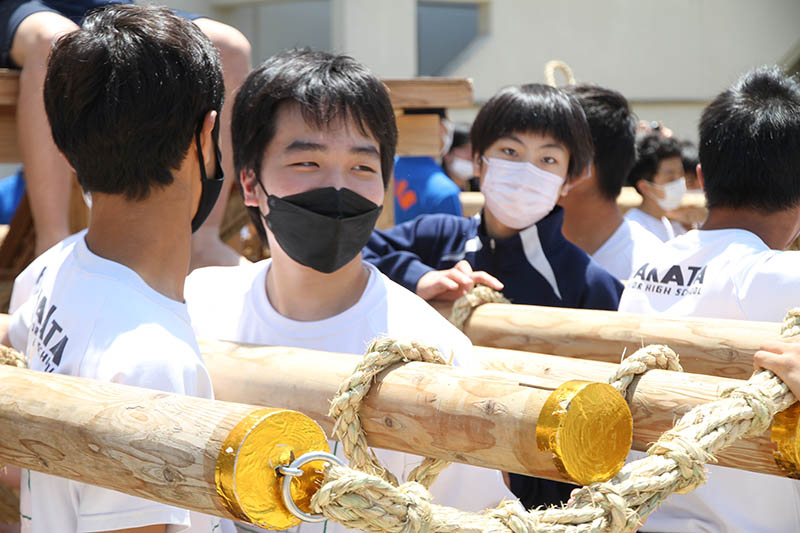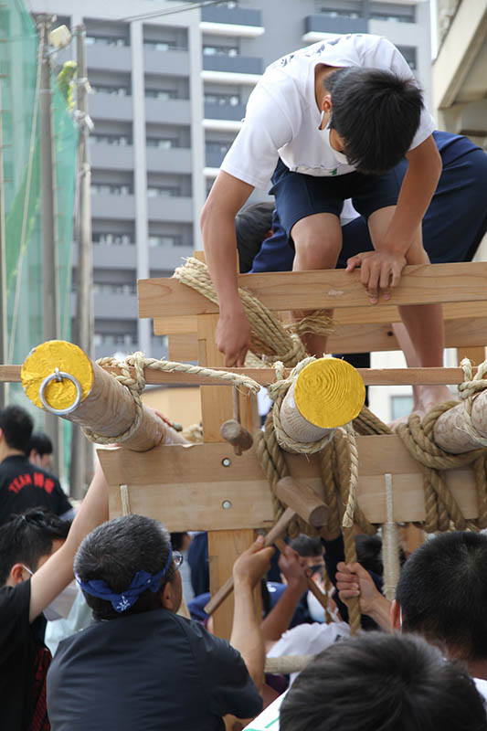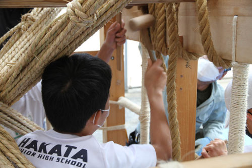 山笠台の上や中に入った生徒は、「棒締めた、棒締めた」と声をあげながら、荒縄を木槌で叩いて荒縄の空気を抜きしっかりと締め上げてきます。