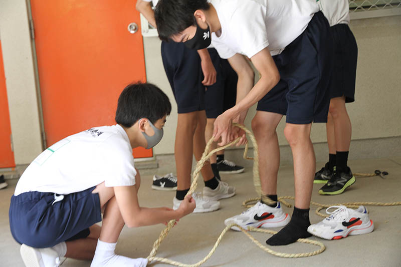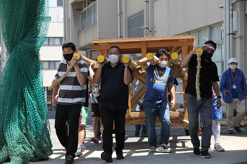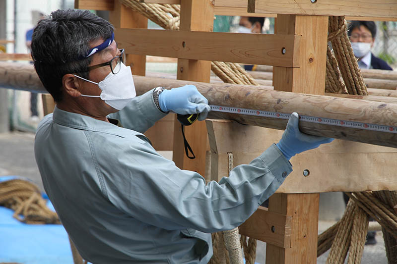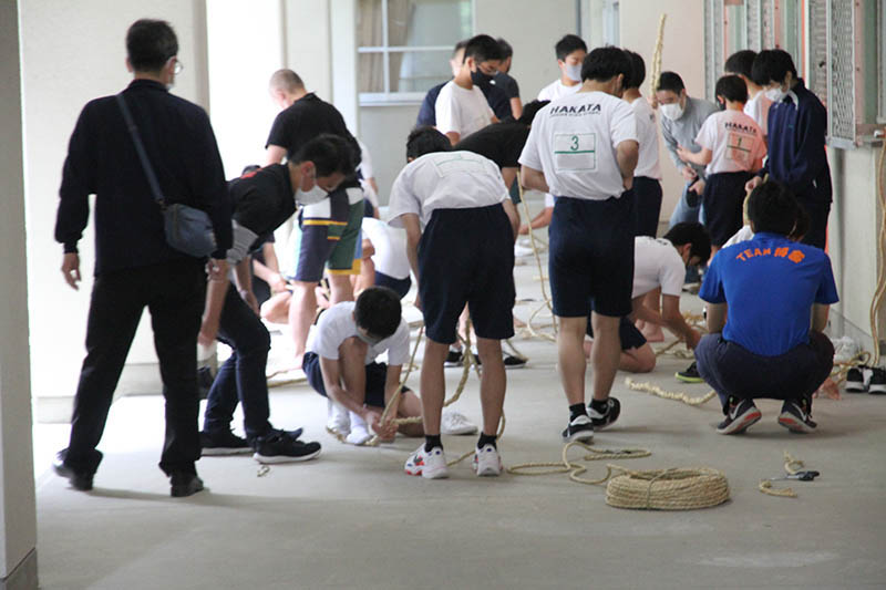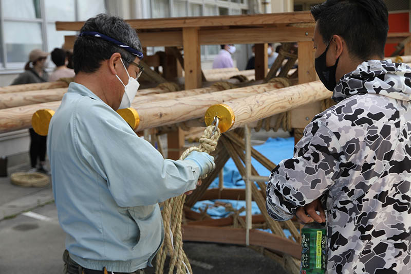 はっぱの会のメンバーも山大工と同様に縄を掛け、生徒が縄をさばきます。入学して一度も舁き山を経験していない学年が担当していることもあり、山大工やはっぱの会のメンバーは丁寧に作業内容を説明していきます。しかし、それははっぱの会のメンバーも同様で、2年ぶりの縄掛けで縄を掛ける順番に戸惑う様子も見られ、伝統文化における2年間の空白期間の恐ろしさを目の当たりにしました。これは博多の山笠だけでなく。日本全国で同様の問題に直面する団体や祭りが数多くあるだろうな、と感じました。