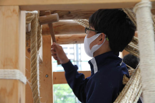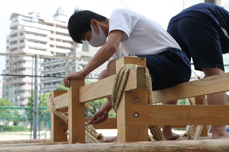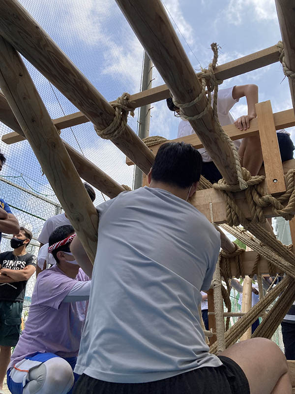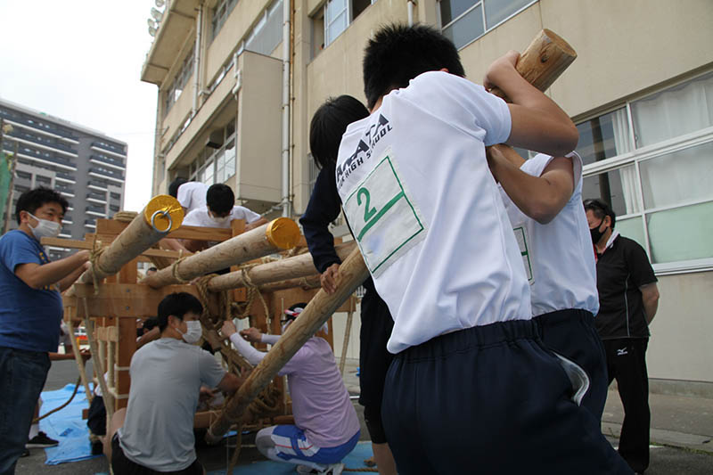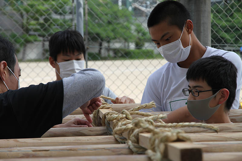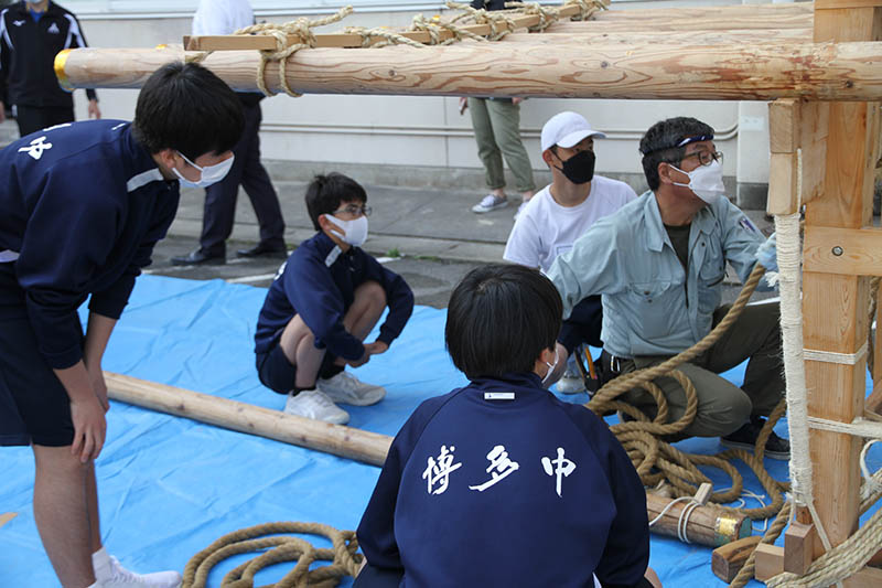 生徒は入れ替わりながら6本の棒を山笠台に縛り上げて棒締めを行い、無事2基の山笠台を完成させることができました。