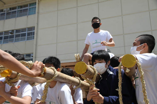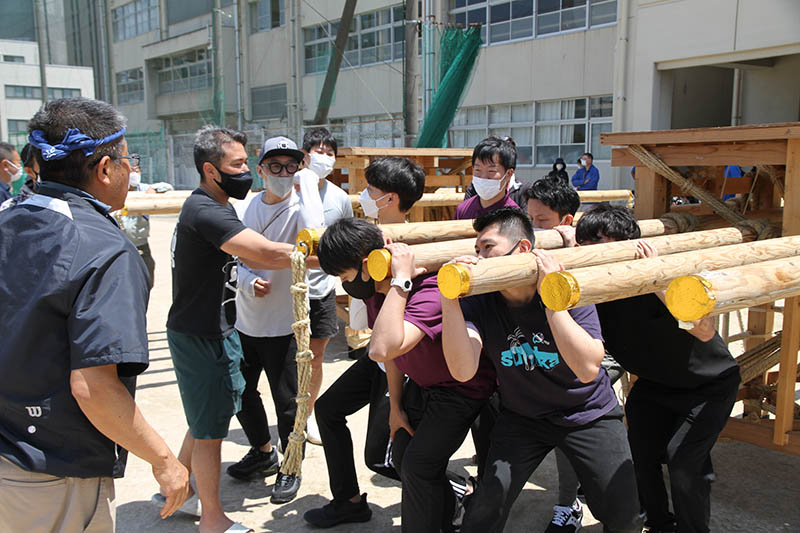 先生のレクチャーが終わると、生徒たちが出来上がったばかりの舁き縄を棒に掛けて、棒に付きました。後押しは先生たちが担当します。
