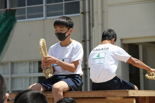 この山笠台は3つのグループに分かれた生徒たちの手によって作られたもので、自分たちで山笠を組み立て、小巻縄を作り、八文字縄を掛けるなど、山笠作りを1から体験。そのうえで、今日の棒締めを迎えました。これは伝統文化を学ぶというだけでなく「自分たちの作業が次の作業につながる」「仕事・作業の順番を考える」などの実社会でも生きる事を学びます。