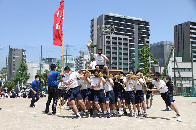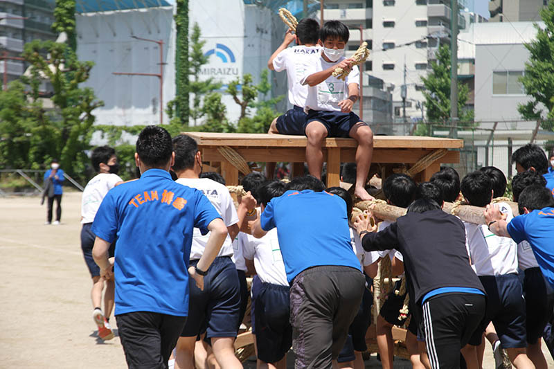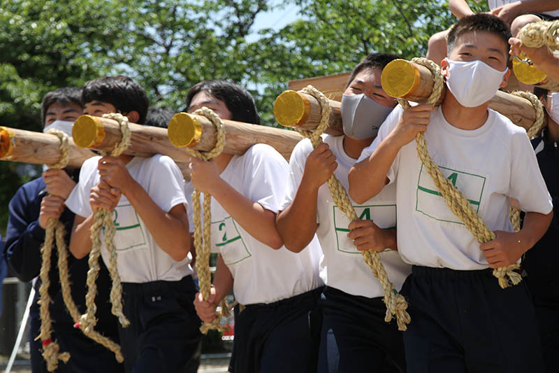そして入場門が作られる場所に、生徒たちの手で山笠台が運ばれます。気がはやるのか思わずスピードが出て慌てて声を上げる生徒も。単に運んだだけなのに、入場門に到着したら2年ぶりに動く山笠台に自然と拍手が起きました。