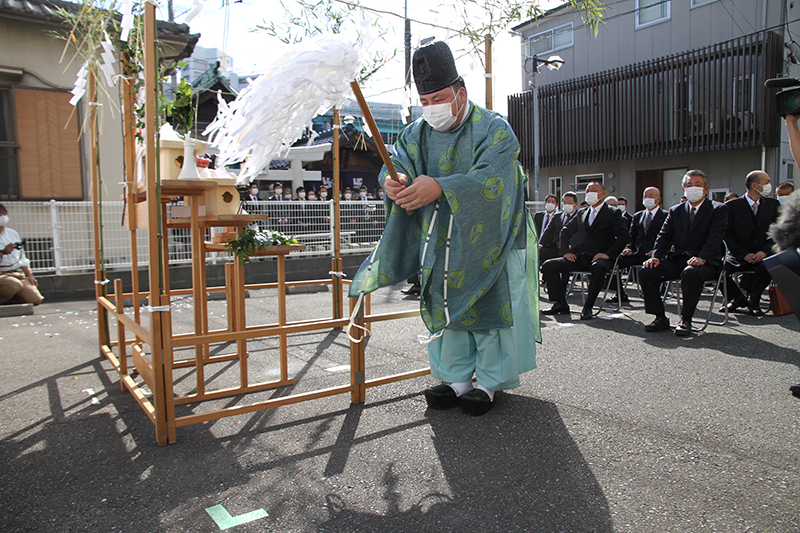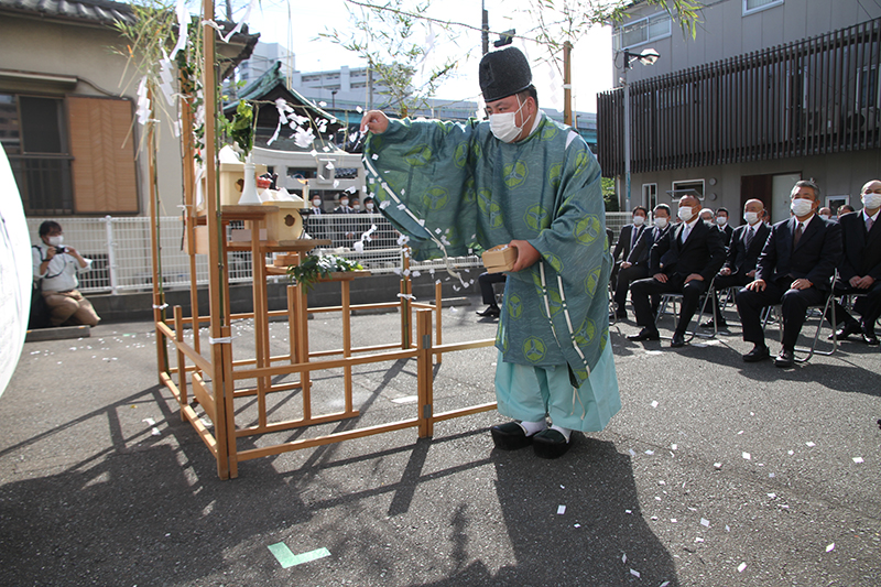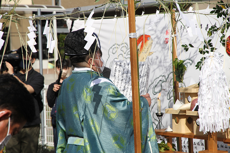 櫛田神社の神職が祭壇と参加者を祓い清めます。