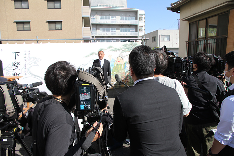 瀬戸代表は「三つ揃えのスーツでこの天気は暑いね!」と笑顔でコメント。「当番町・一番山笠の重責は一年間だけでもやおいかん(※博多弁で簡単でない・厄介)なのに、延期で三年というのはモチベーションの維持が大変でした。トーンダウンしないように頑張ってきましたので、やっと来たかという感じです。」と、三年ぶりの舁き山神事に向けての喜びを語り、一番山笠と当番町の重責について気を引き締めていました。
