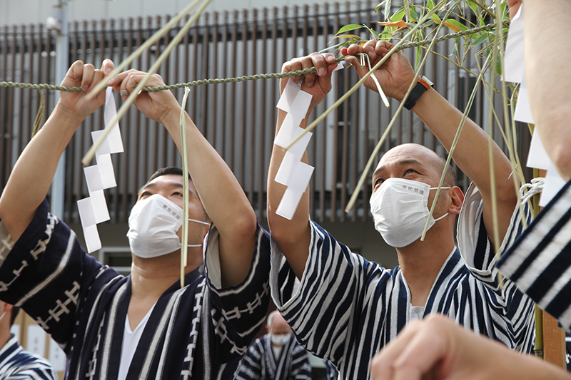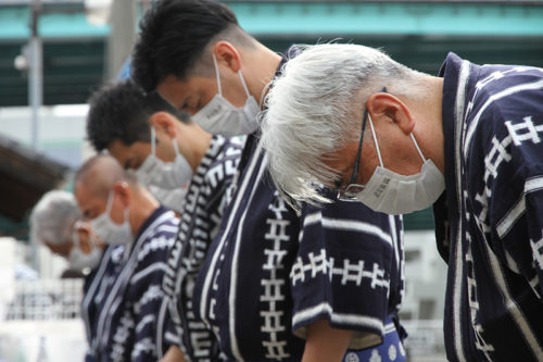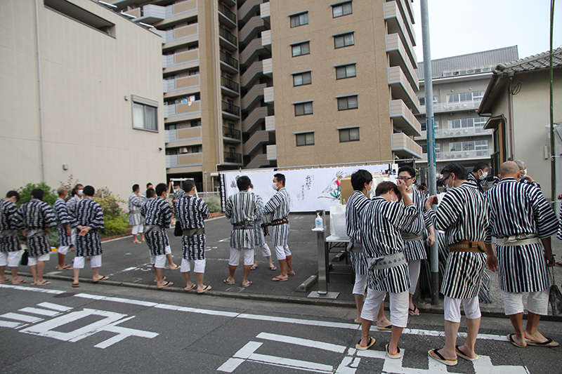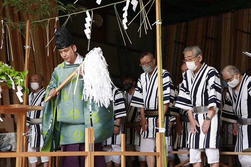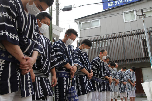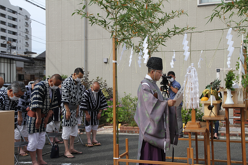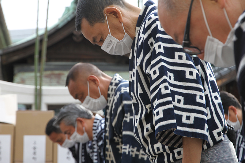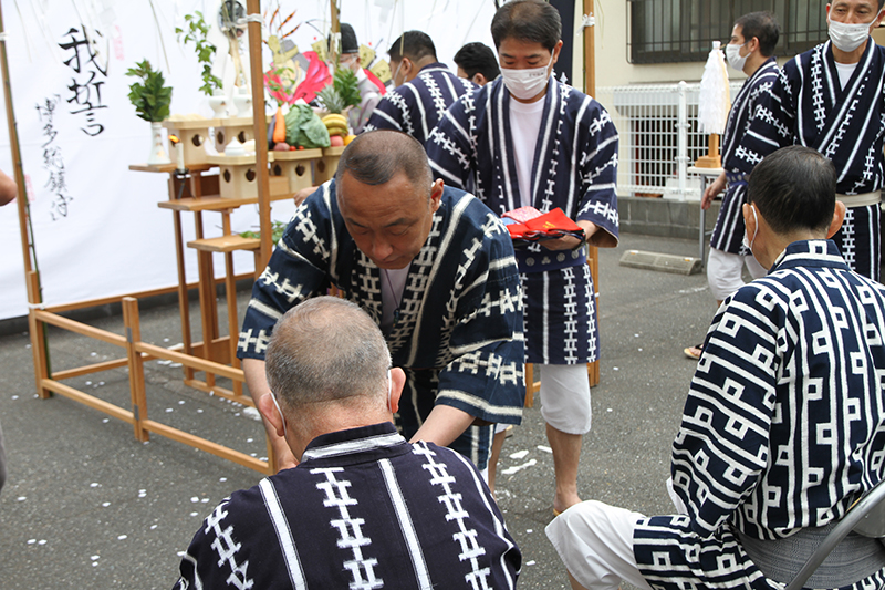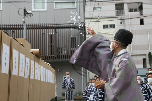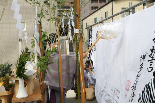 午前8時、小屋入りの神事が始まります。参加者は山笠の清掃である長法被に身を包み、櫛田神社の神職のお祓いを受けます。