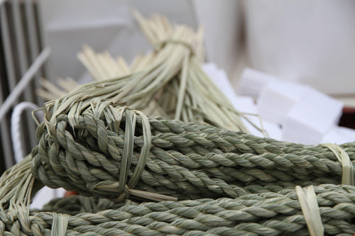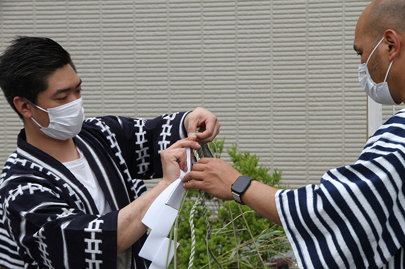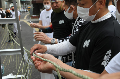 神事後には男達が、笹竹に注連縄を取り付け、先ほど浄めた辻々に注連縄を張って神域化しました。