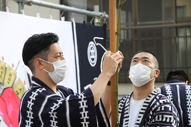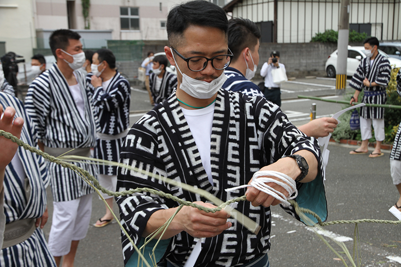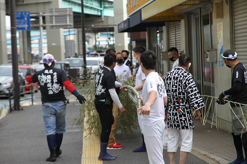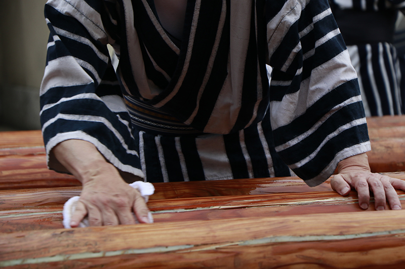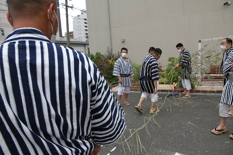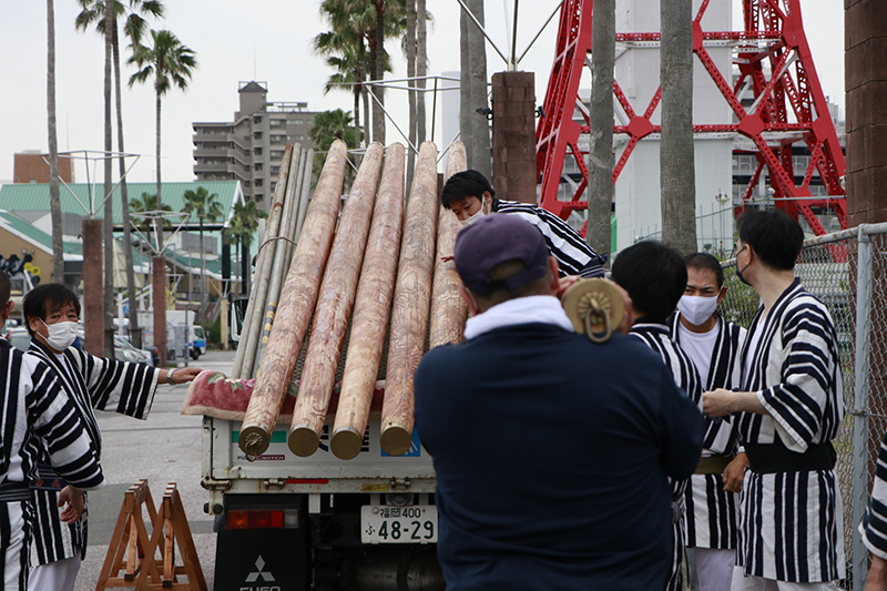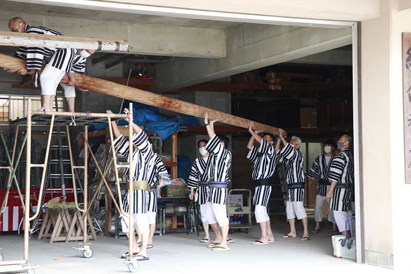 祓い清めた道具は釘を使わずに組まれ、6月中旬に行われる棒締めの時に舁き棒を縛り上げて山笠の土台となる山笠台となります。