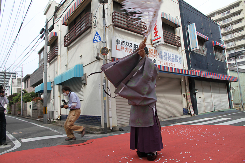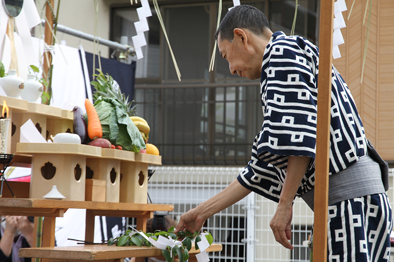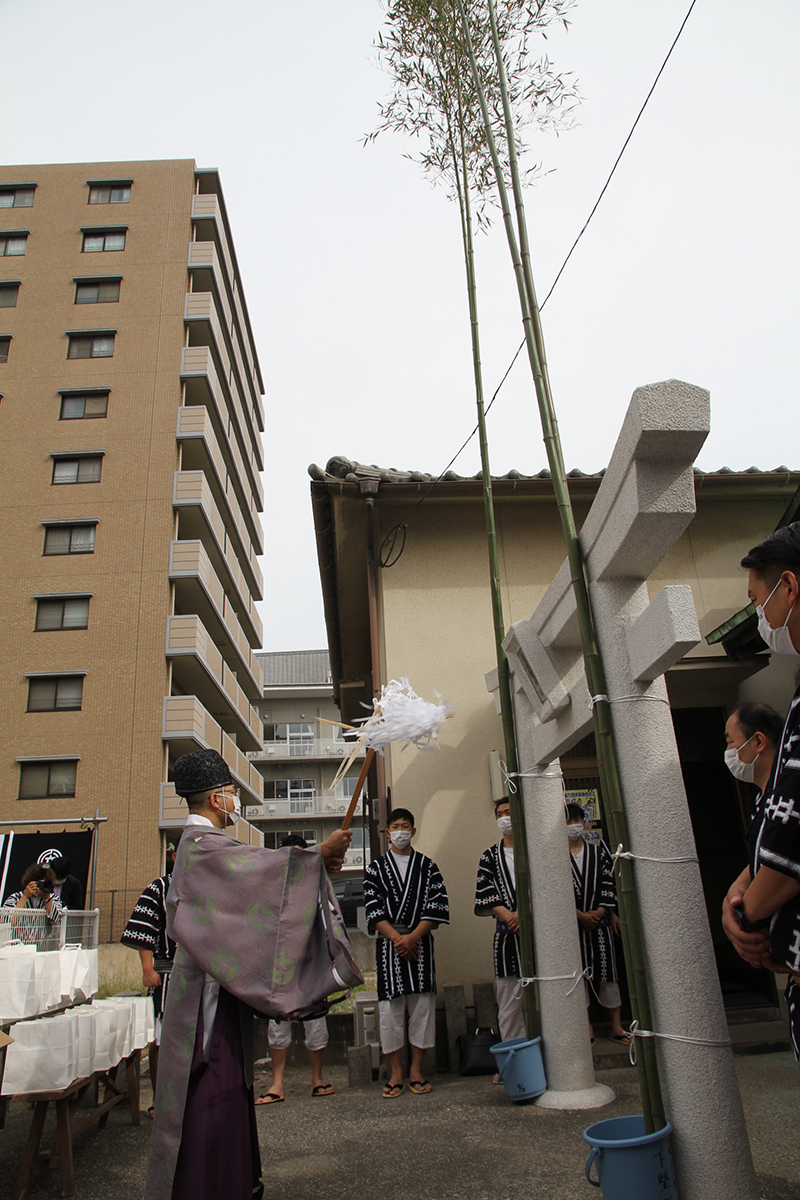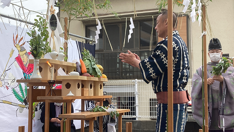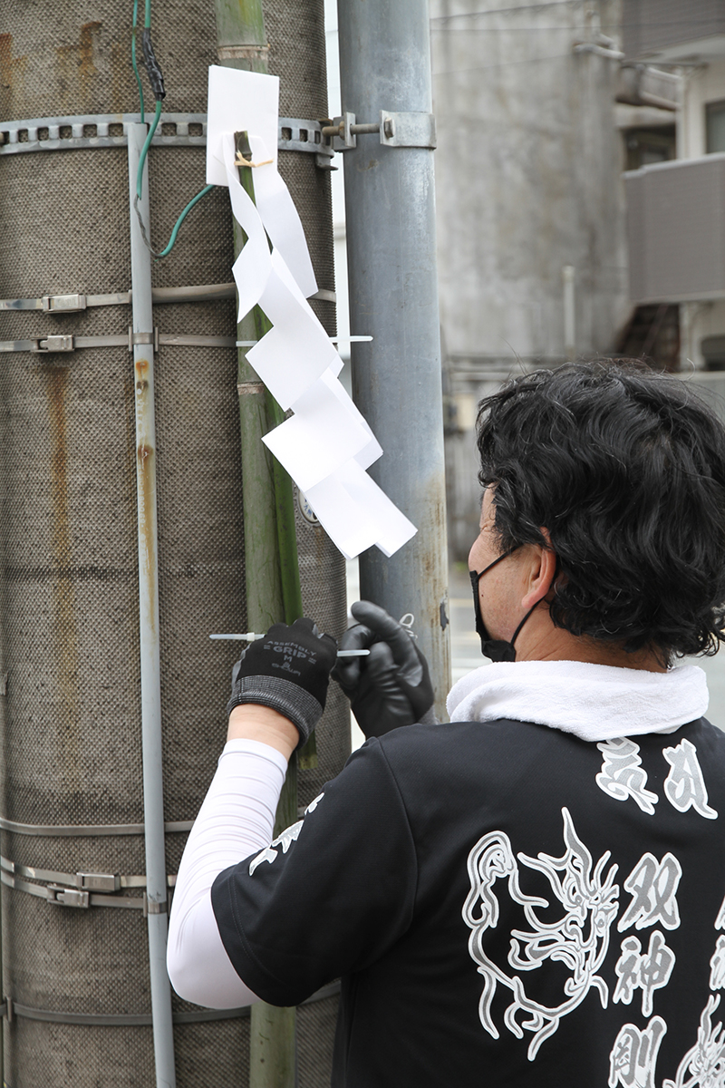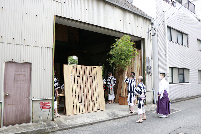 神職は、山小屋が建つこの土地につながる道の辻を祓い清め、この区画の神域化を行い、奉納物である山笠を備える準備を行います。合わせて幕や使用する道具、注連縄を掛ける笹竹もお祓いして浄めます。