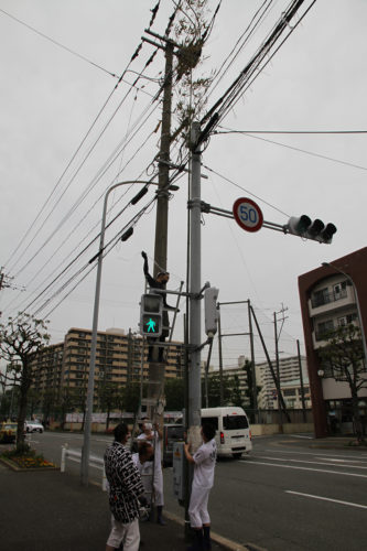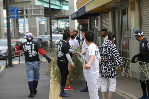 今年の七番山笠千代流も、6月1日に小屋入りの神事を行っています。朝8時過ぎから、男達が注連縄を張った笹竹を辻にかけていきます。
