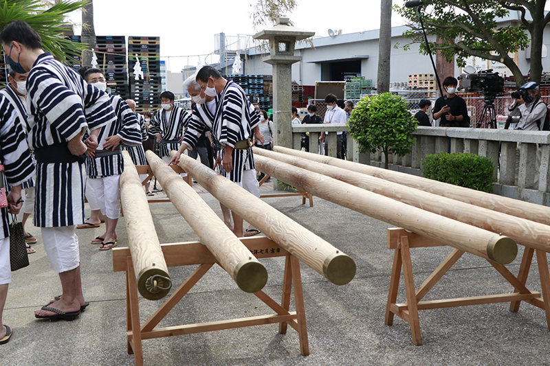 八番山笠上川端通は、6月1日に先陣を切って棒洗いの神事を行います。午前7時半に櫛田神社に集まった男達は、櫛田神社の神庫より舁き棒を預かり、一路ベイサイドプレイス博多の先端にある櫛田神社浜宮へ。浜宮に付くと舁き棒を並べます。上川端通の舁き棒は舁き山よりも長いため浜宮に収まらないため、横向きに入れて並べます。