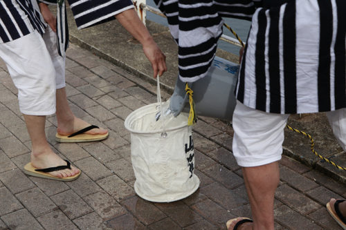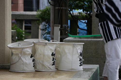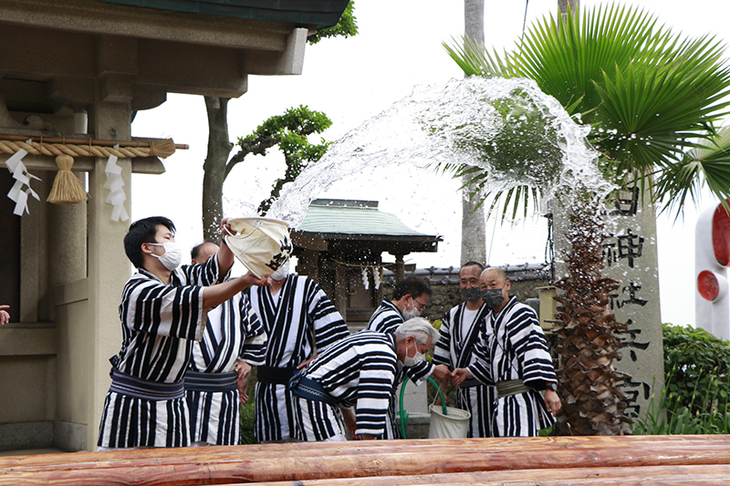 博多湾からお清めの海水を汲み上げ、お祓いを受けて棒洗いの神事を開始します。
