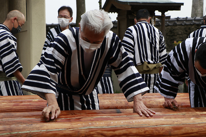 海水を掛け浄めた後、たわしと洗剤を使って棒に付いた一年間の汚れを落としていきます。
