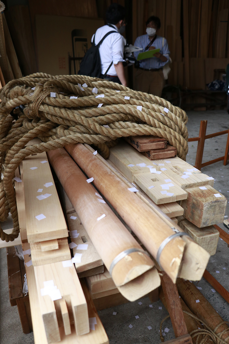 午前10時半より小屋入りの神事を行い、山小屋に使用する建材や山笠台に使用する具材や荒縄などを祓い清めました。