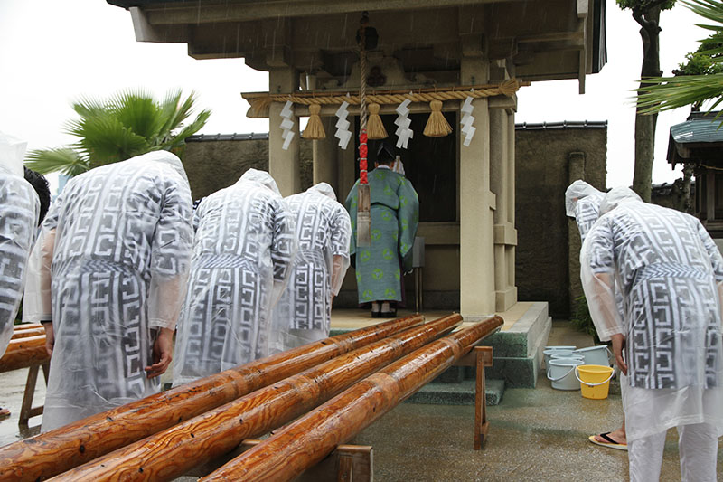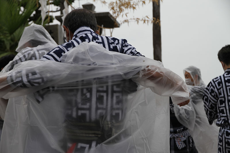 ポツポツと降る雨の中、櫛田神社浜宮に到着したキャナルシティ博多の関係者は、長法被の上に合羽を着こみます。棒洗いの後は小屋入りの神事を行うため、長法被を濡らすわけにはいきません。