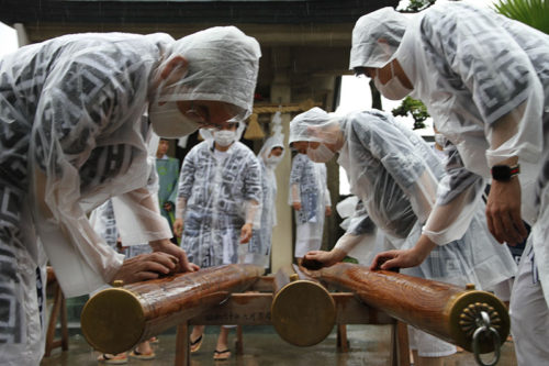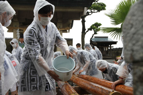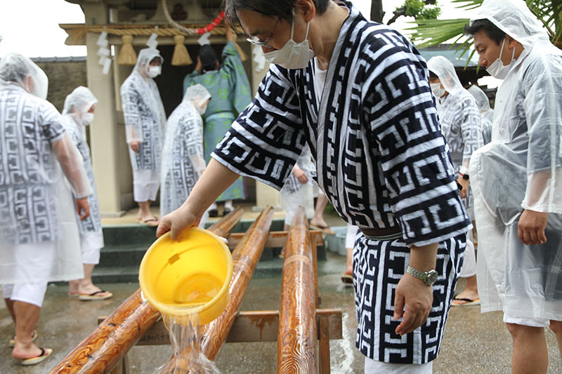 浄め祓いの儀にて、洗い清めた舁き棒や、棒締めに使用する道具などを、櫛田神社の神職が祓い清めます。