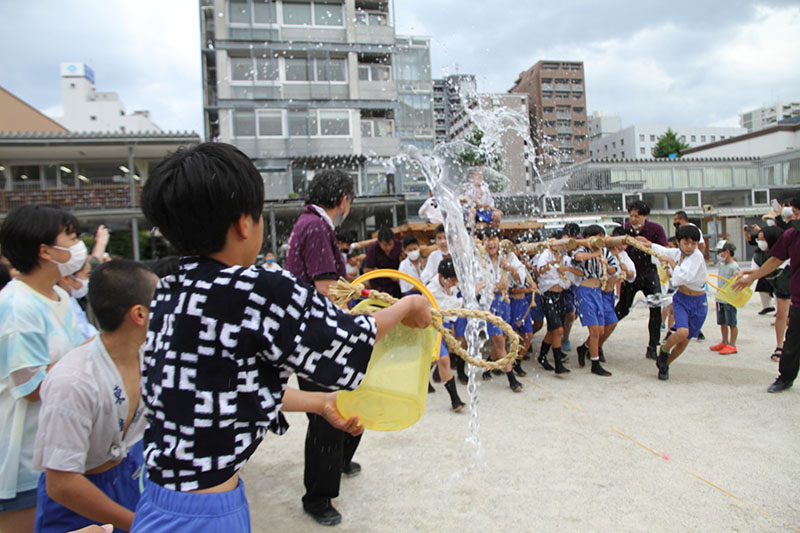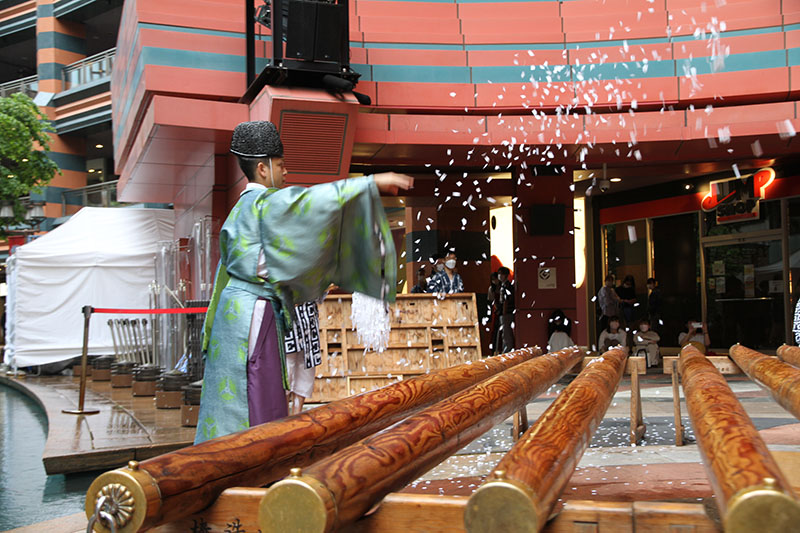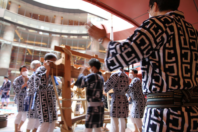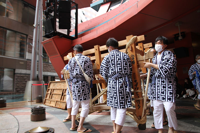舁き棒を洗い清め終わると。舁き棒をキャナルシティに持ち帰り、小屋入りの神事の準備を行います。