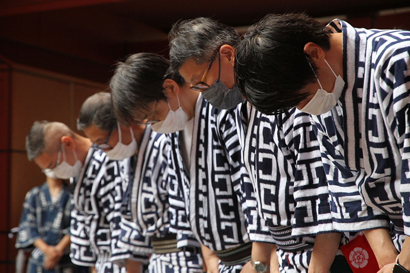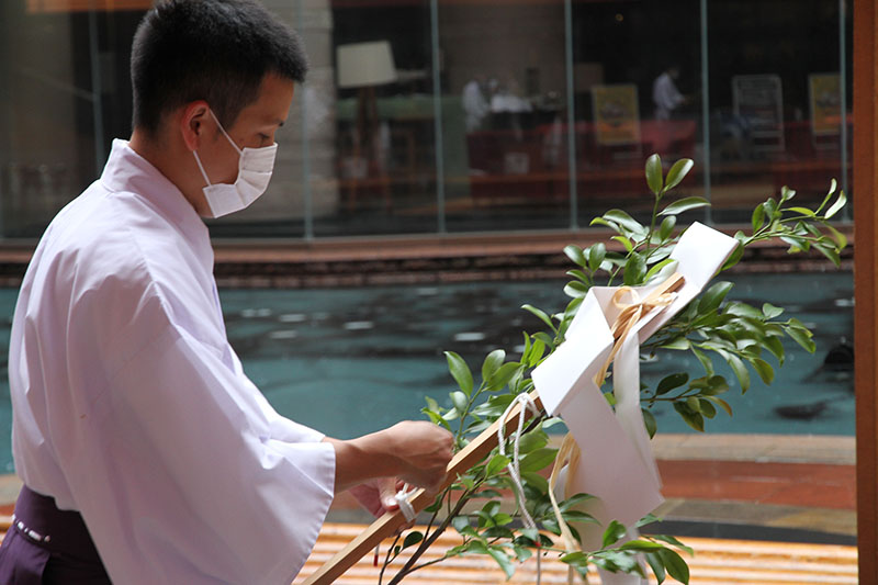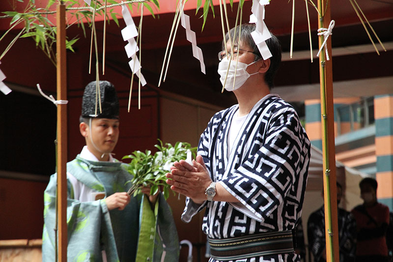 総務ら参加者が神に玉串を捧げ、飾り山奉納までの無事建設と無事奉納を祈願しました。