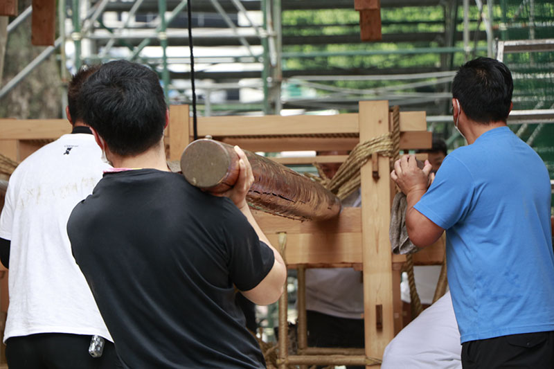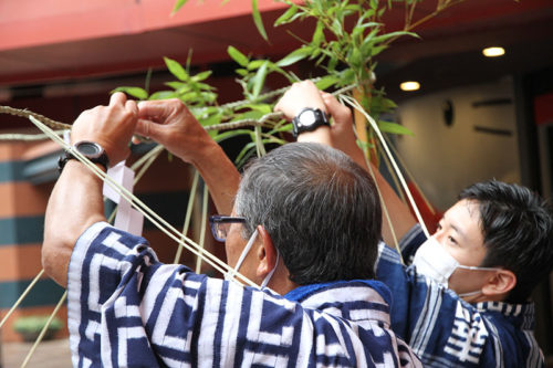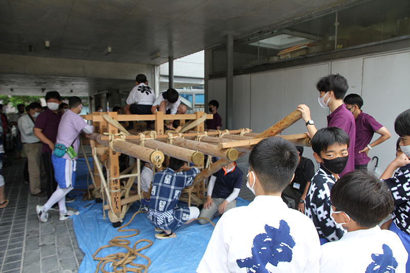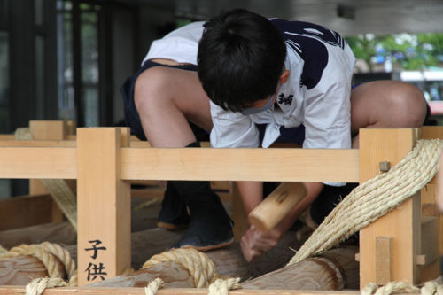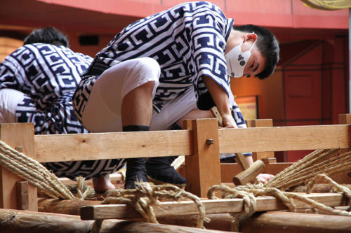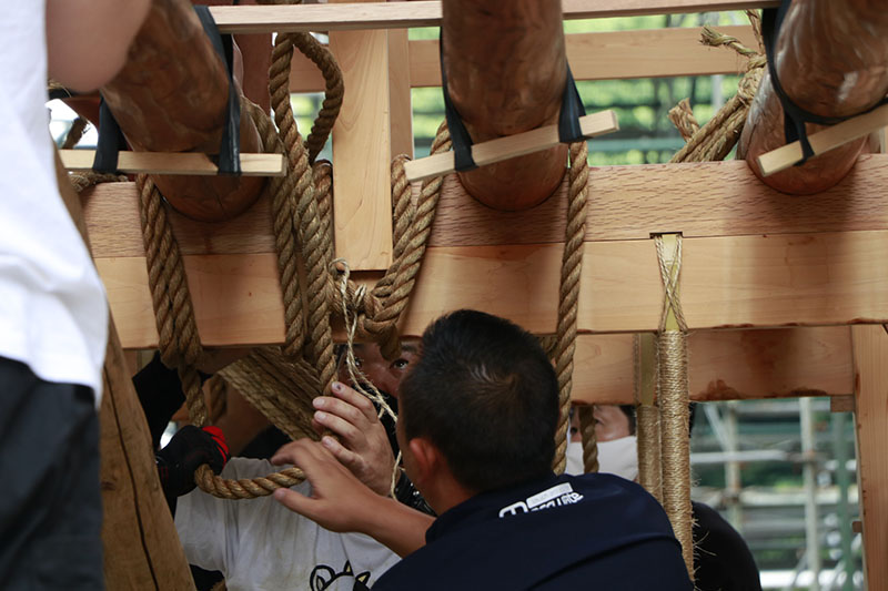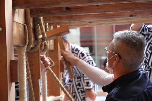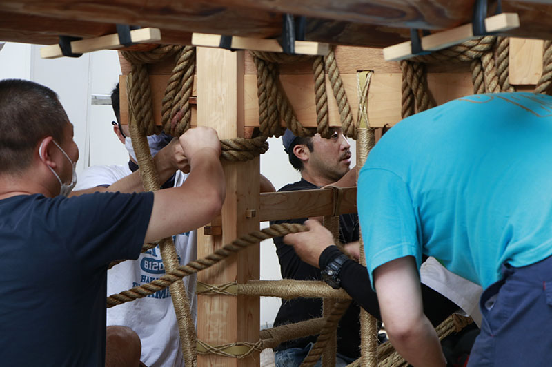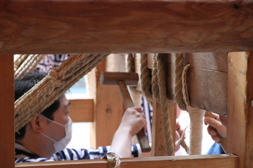 桟敷席建設の裏で行われていた東流の有志が行う棒締めの作業。笑顔に満ちた雰囲気の中、今年の飾り山の準備が進められました。