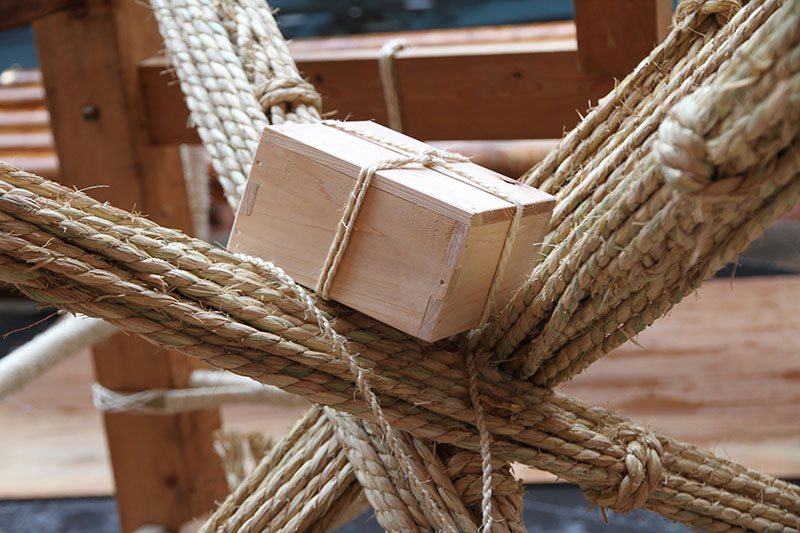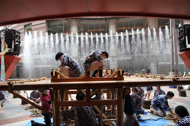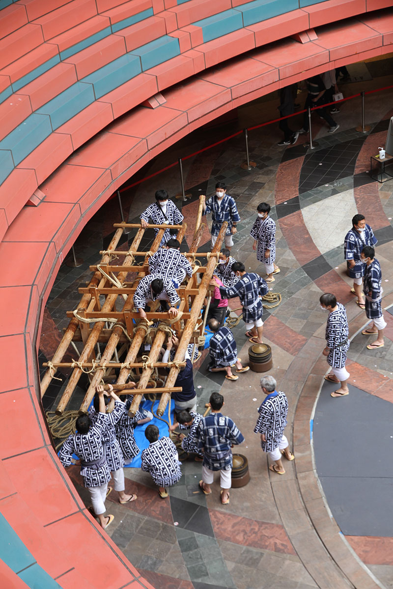 午前10時前より開始した棒締めの作業。「棒締めたー!」の声とともにキャンルシティ内に響き渡る、縄が締まっていく音と木づちの音に、施設内を通る人が思わず足を止めて様子を見物する姿もたくさん見られました。棒締めも無事に終了したキャナルシティ博多。矢切(骨組み)を立てたうえで、月末の飾り付けの時を待ちます。