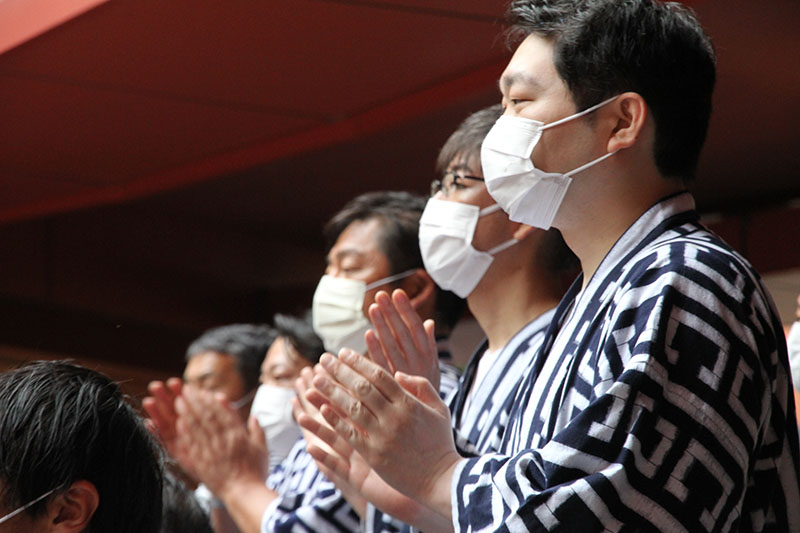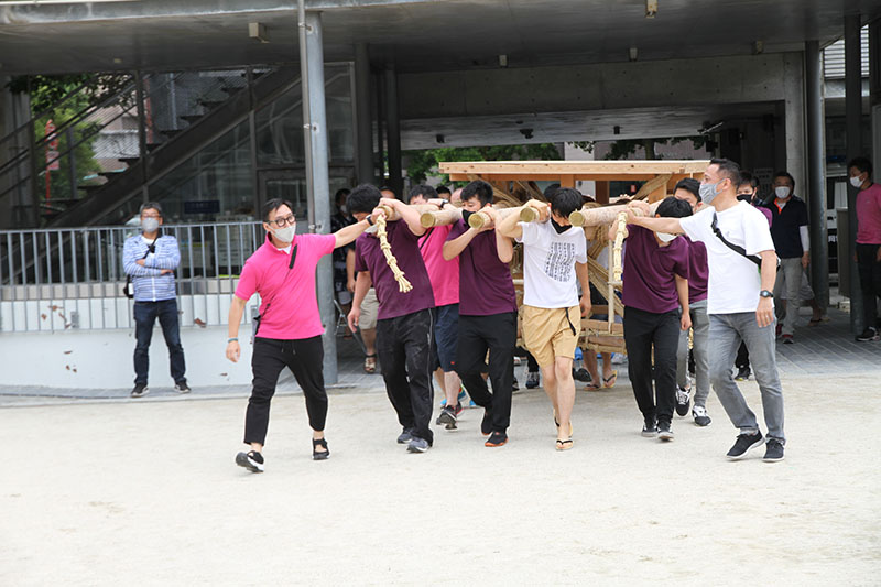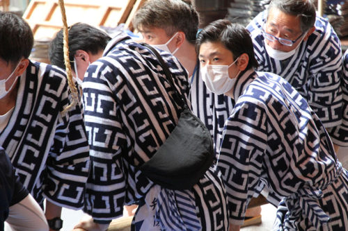 試し舁きは聖とのグループを入れ変えつつ行います。入れ変え時に先生はアルコールで舁き棒を消毒。生徒たちも舁き棒に付く前に手を消毒して、山舁きに臨みます。
