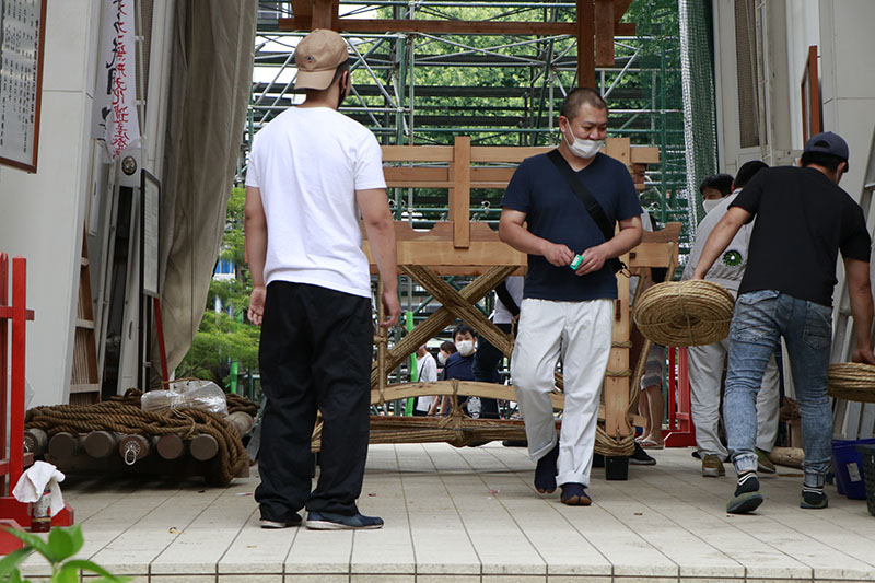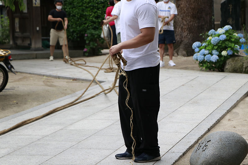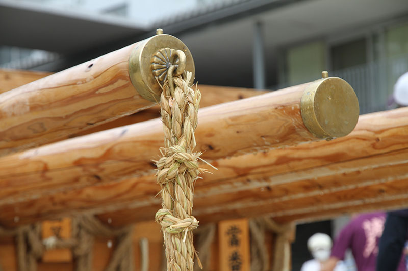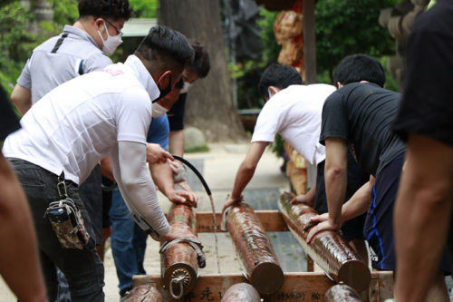 神事が終わるとすぐに片づけを行い、棒締めの準備へ。棒洗い・小屋入り・棒締めと、飾り山の準備が着々と進んでいきます。