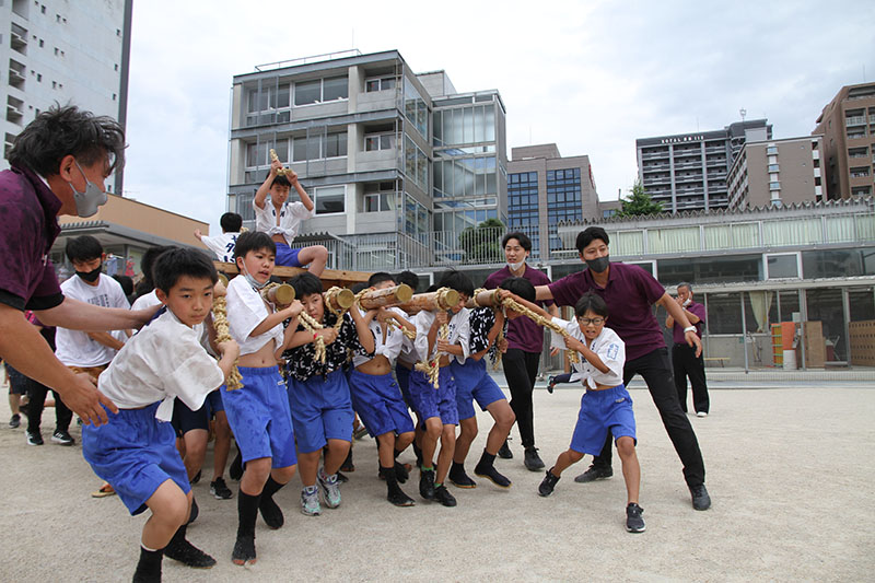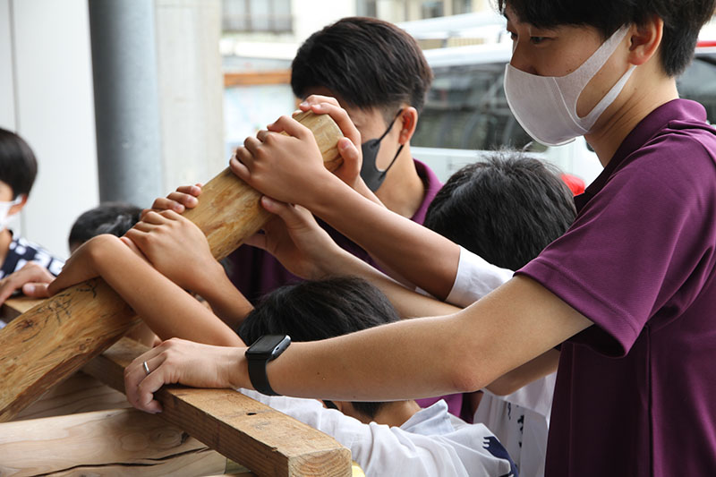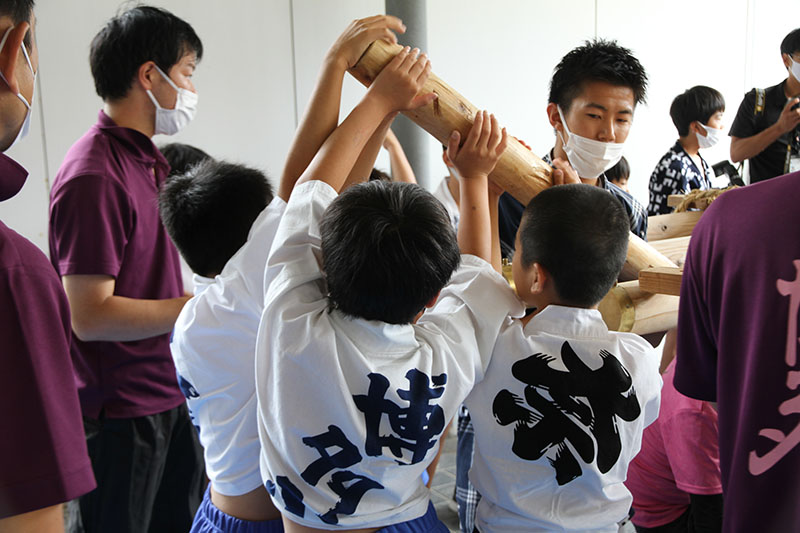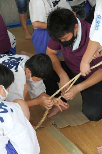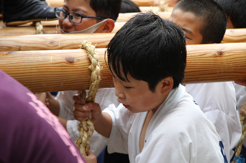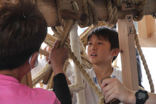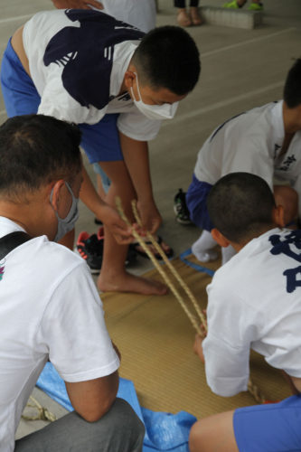 舁き縄作りと棒締めは2つのグループが入れ替わって、それぞれの作業を体験。棒締めも大人たちのアドバイスと協力の元、元気よく「棒締めた!棒締めた!」の掛け声を上げながら、自分達の力で作業を進めていきます。