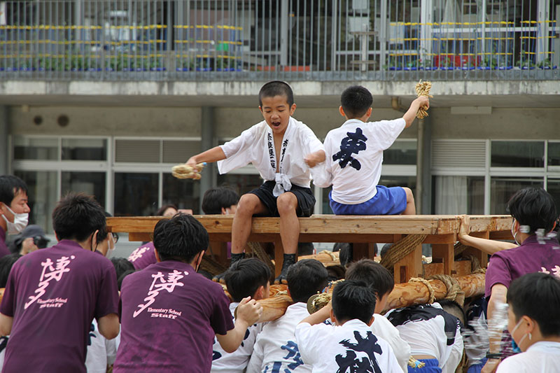 1分前のコールを受けると、台上がりの子が「声を出していくぞ!」と全員に気合の檄を入れます。「おお!」と応じた舁き手の子供達、3!2!1!の声とともに、舁き出しました。