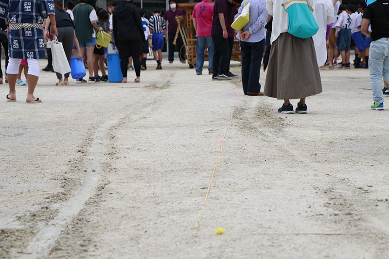 グラウンドを一周した山笠台はまっすぐに太鼓台前へ。山笠台が付けた轍が3年ぶりの山舁きの喜びを物語ります。