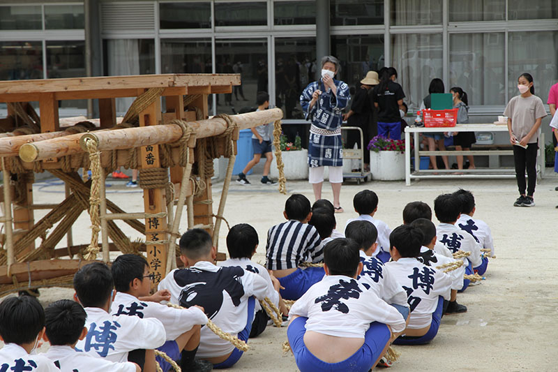 博多小学校では、「博多の文化を学ぶ」というテーマで行われている「博多小 子供山笠」の準備として、小学校6年らが舁き縄づくり(縄ない)と棒締めの作業を体験しました。