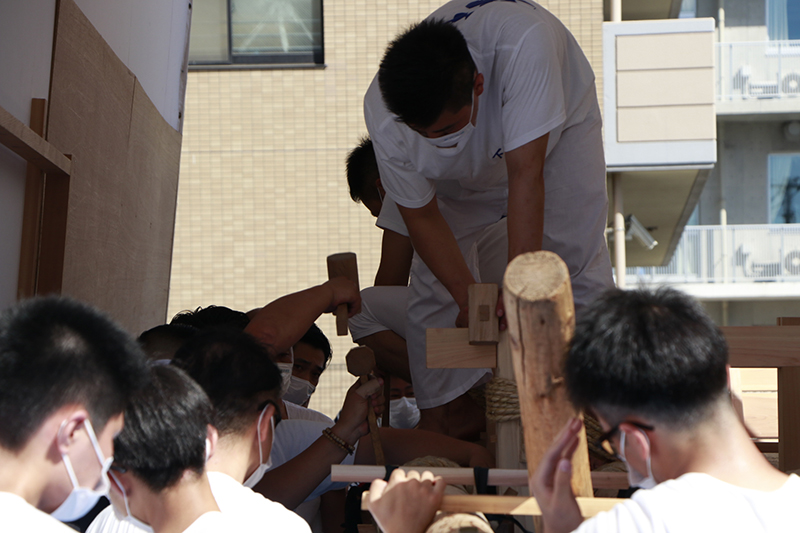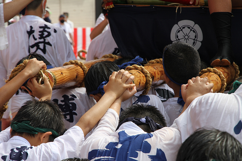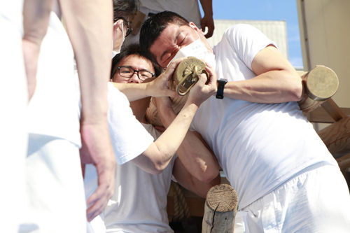 棒締めが終わると、いよいよ試し舁き。舁き棒に肩を入れるのは3年ぶり。水法被にステテコ、地下足袋に舁き縄という試し舁きの装束で、赤手拭の男達が山小屋に集まります。
